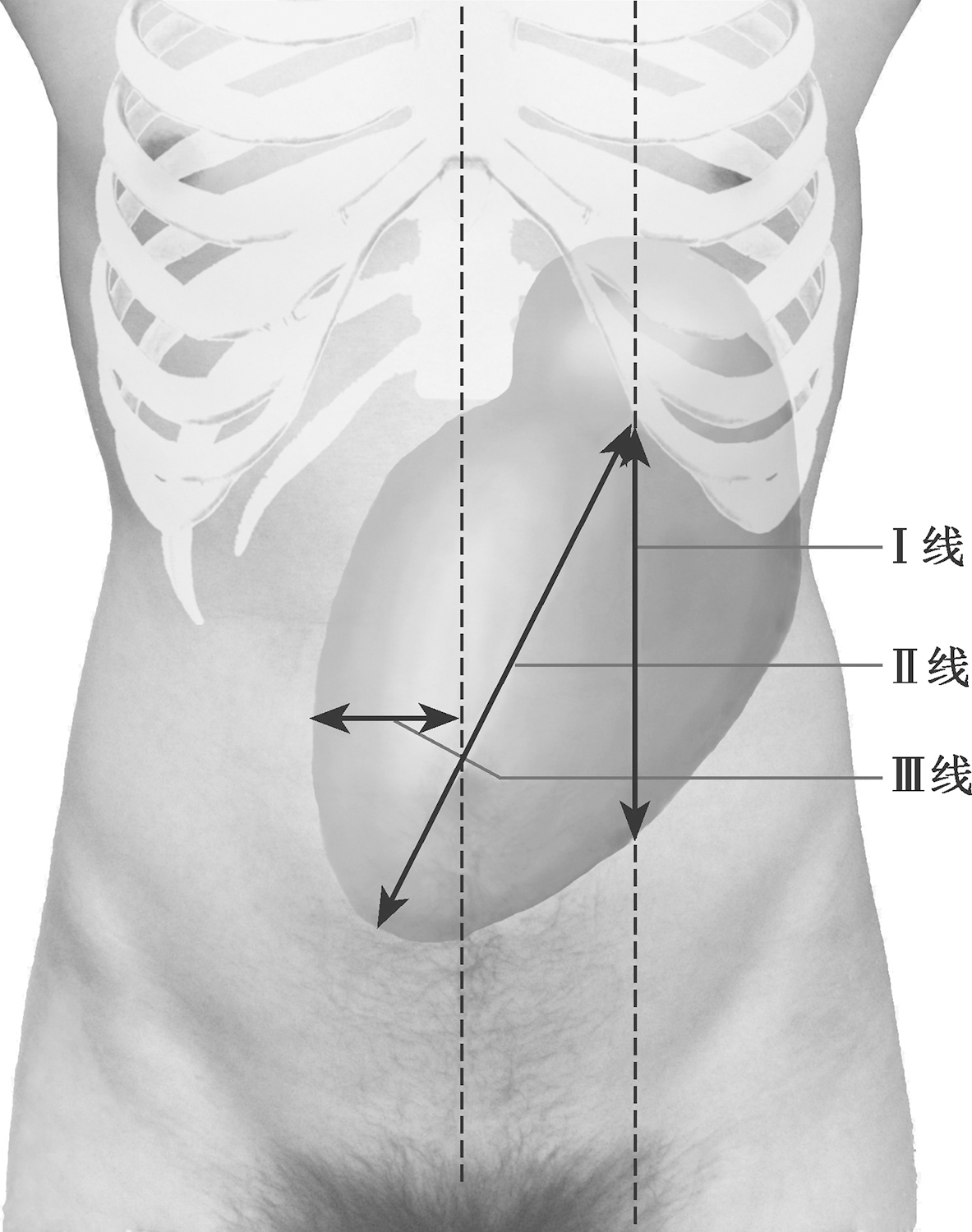 脾脏肿大的测量法见 图3-5-6 。脾脏轻度肿大只做第Ⅰ线测量;明显肿大时加测第Ⅱ线和第Ⅲ线。