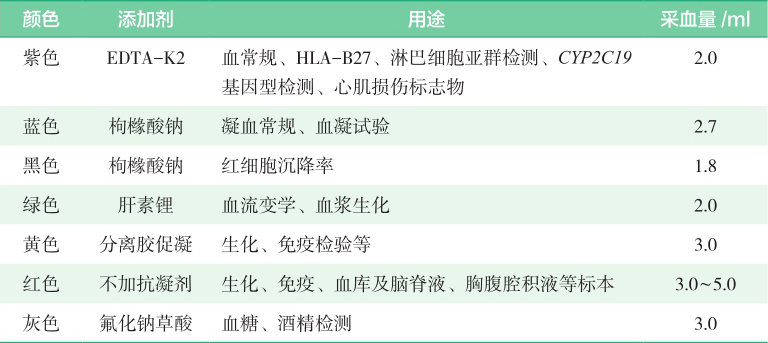 需血量较多时采用,通常选择肘部静脉。目前多采用一次性真空采血管,部分采血管含不同抗凝剂或其他添加剂,均用不同颜色头盖标记以便识别 (表4-2-1) 。
