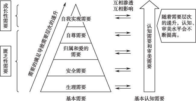 美国心理学家马斯洛曾提出需要层次理论(图2-1)。他认为可把人的需要分为五个层次:生理的需要、安全的需要、归属和爱的需要、尊重的需要和自我实现的需要。需要的这五个层次,是由低到高逐级形成并逐级得以满足的。