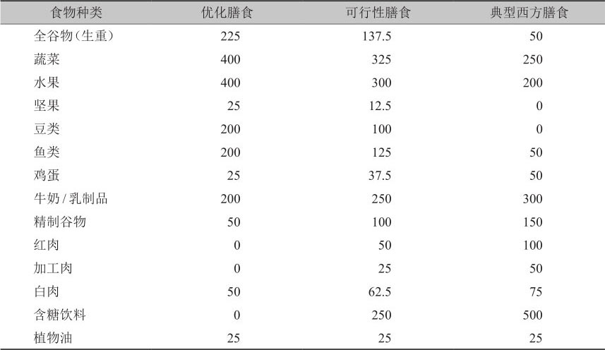 与典型西方膳食相比,优化膳食增加了全谷物、豆类、鱼类、水果、蔬菜摄入量,包括少量坚果,减少了红肉、加工肉、含糖饮料和精制谷物的摄入量。可行性膳食模式综合考虑膳食合理性与实际可行性,是介于优化膳食和典型西方膳食模式之间的选择。三种膳食模式各类食物每日摄入量见表1-1。
