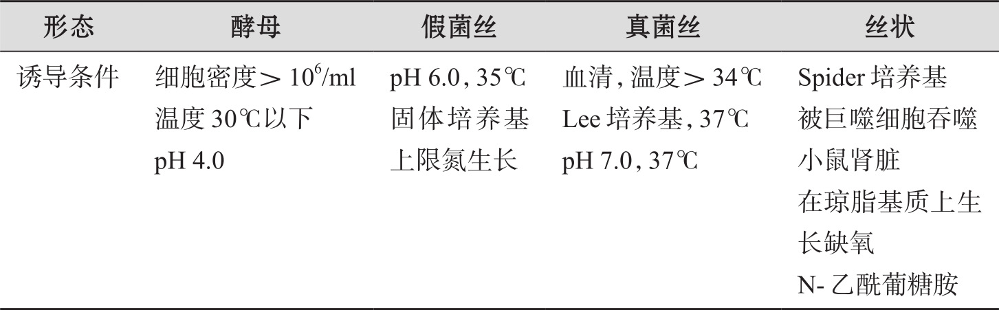 白念珠菌的形态发生与其致病性密切相关,在生长过程中,依据极性生长程度不同,可分为3种形态——酵母态、假菌丝和真菌丝(表3-2)。此外,它还可以在正常酵母形态(白色,white)和伸长的细胞形态(不透明色,opaque)之间转换,被称为white-opaque转换。白念珠菌能以酵母态(即芽生孢子)、真菌丝与假菌丝3种细胞形态存在。酵母态的白念珠菌与酿酒酵母(Saccharomyces cerevisiae)相似,为卵圆形细胞,并且彼此之间易分离。真菌丝是完全平行延伸的管状菌丝,并且在细胞间隔处没有缢缩。假菌丝是一串伸长的酵母态细胞,各个细胞之间没有分离,其细胞间有明显分界,形成缢缩。假菌丝易形成分支,这样可能有利于其汲取营养。不同形态的白念珠菌形成的菌落也不相同,主要差别为:①真菌丝和假菌丝形成的菌落会侵入琼脂下层;②真菌丝和假菌丝的存在使得菌落呈现小圆齿状,而酵母态形成的菌落是光滑的,不同形态的白念珠菌在菌落中所占比例的不同可导致菌落形状的差异;③含有真菌丝的菌落边缘经常延伸出羽毛状突出物。研究表明,基因毒性应激即当DNA受到损伤时,DNA复制/损伤检验点被激活,也可调控白念珠菌丝状生长。如敲除DNA损伤修复的基因或加入抑制DNA复制的药物,可以诱发菌丝生长。许多环境诱因可影响白念珠菌的形态,培养基的pH在6.0~7.0,且温度高于35℃时有助于形成菌丝,血清因子能有效诱导菌丝生成,其他因素如N-乙酰葡糖胺及一些特殊营养成分都会诱导细胞以使菌丝生长。此外,细胞密度也会影响白念珠菌细胞形态,由于群体感应,高细胞密度时倾向于酵母形态的生长,低细胞密度时更倾向于菌丝生长。