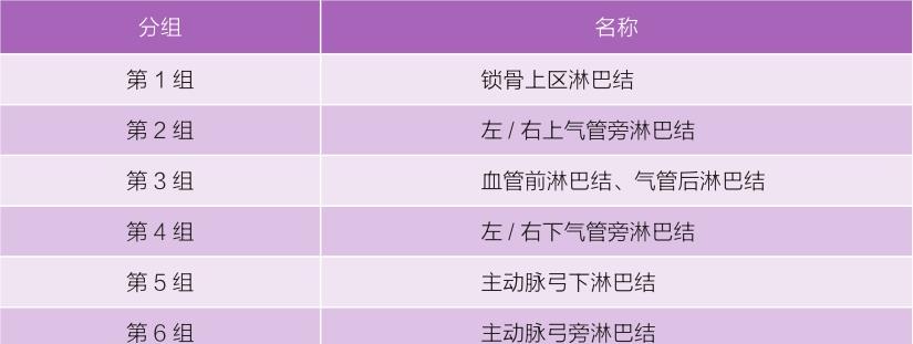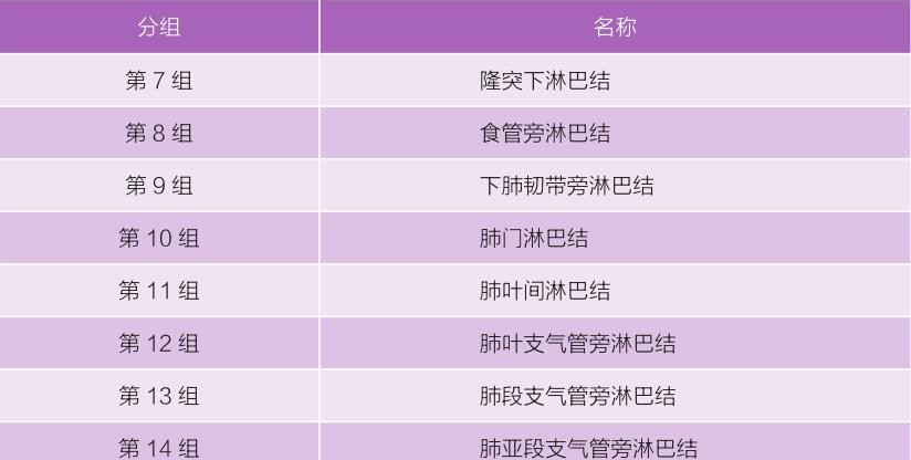 依据淋巴结所在的位置,这14组淋巴结又被分为三个区域,分别是:第1组锁骨上淋巴结单分一类;第2~9组被称为纵隔淋巴结;第10~14组被称为肺内淋巴结。