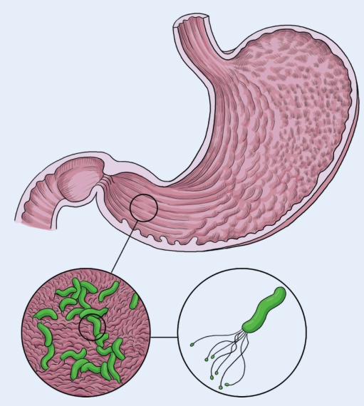 幽门螺杆菌是一种螺旋形、微厌氧、对生长条件要求十分苛刻的革兰氏阴性螺状杆菌。1982年首次在体外培养成功。幽门螺杆菌的发现者巴里·马歇尔(Barry Marshall)和罗宾·沃伦(Robin Warren)由此荣获2005年诺贝尔生理学或医学奖。研究显示,约10%的幽门螺杆菌感染者患有胃部疾病,其他感染者可无明显症状,5/万的感染者可能最终罹患胃癌。很多研究证实,幽门螺杆菌感染是罹患胃癌的重要危险因素。1994年,国际癌症研究中心将幽门螺杆菌定为Ⅰ类致癌物。另有多项研究发现,根除幽门螺杆菌感染可以降低胃癌风险。在一项6年的干预试验中,发现采用三联疗法根除幽门螺杆菌感染能有效地逆转胃癌的癌前病变。另一项在荷兰进行的研究发现,对胃食管反流患者进行抗幽门螺杆菌治疗并根除幽门螺杆菌感染能有效地减轻胃窦的炎性反应、逆转胃黏膜的萎缩,但抗幽门螺杆菌治疗无法逆转胃黏膜的肠上皮化生。在我国山东省临朐县胃癌高发区开展的随机干预研究显示,根治幽门螺杆菌能够降低胃部癌前病变和胃癌的发病率。