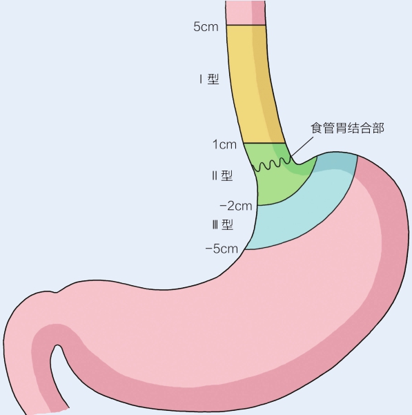 食管胃交界部癌是指发生于食管胃交界部上下5cm内的癌,国内既往统称为贲门癌。1998年,Siewert和Stein创立了Siewert分型系统,该分型系统以解剖贲门为标志将食管胃交界部癌分为三种类型:①肿瘤中心位于食管胃结合部近端1~5cm之间者称为Siewert Ⅰ型,为食管下段腺癌;②肿瘤中心位于食管胃交界部近端1cm与远端2cm之间者称为Siewert Ⅱ型,为真正意义上的贲门癌;③肿瘤中心位于食管胃交界部远端2~5cm之间者称为Siewert Ⅲ型,为贲门下癌。