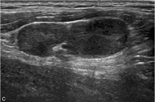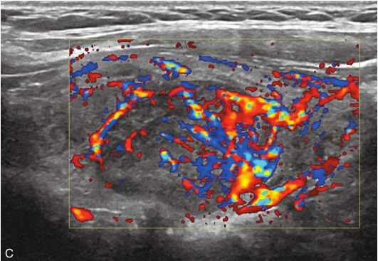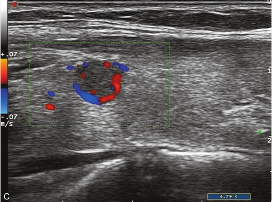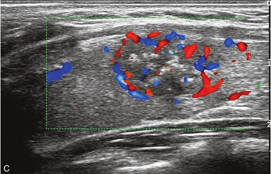 A.甲状腺右叶结节横切面;B.甲状腺右叶结节纵切面;C.甲状腺右叶结节CDFI血流图