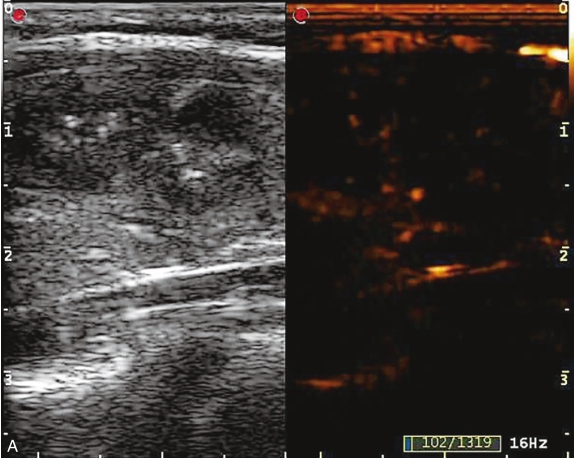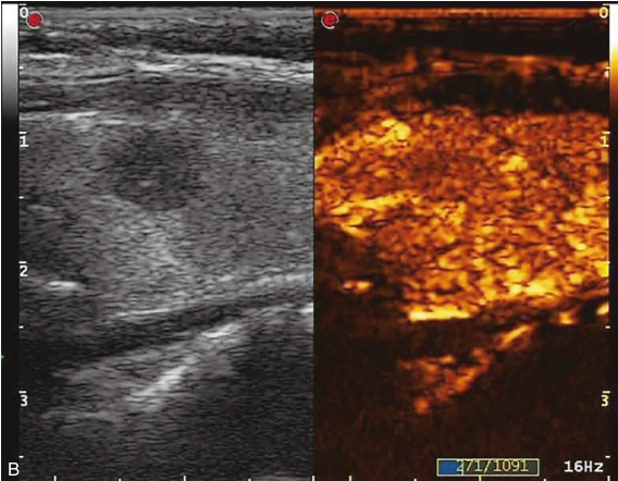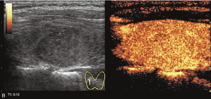 髓样癌体积较小时与乳头状癌的鉴别存在困难,内部丰富血流是髓样癌的主要特点,超声造影表现为中等偏低增强,与乳头状癌明显的低增强表现有别。