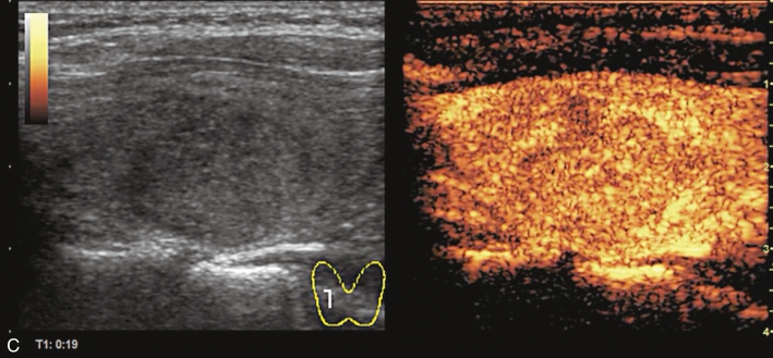 甲状腺右叶上部结节超声造影后早于周围组织开始出现增强,达峰时呈偏低增强表现,边界不清,范围未见明显扩大,之后快速消退,晚期呈明显低增强,结节旁甲状腺被膜增强完整,见图1-9-6、ER1-9-3。