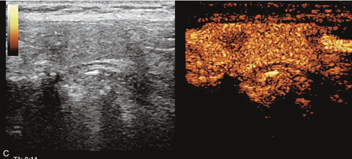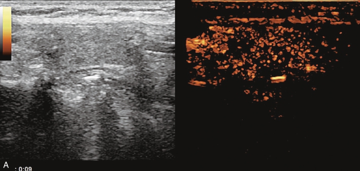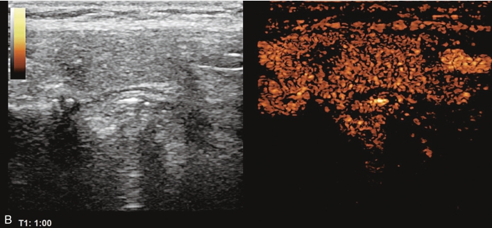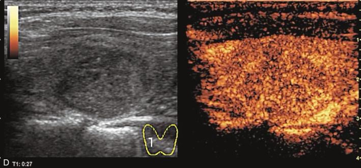 甲状腺右叶中部结节超声造影后早于周围组织开始,自周边向中心逐渐增强,达峰时呈不均匀等增强,增强范围较常规超声增大,周边可见不规则环状高增强,结节前方甲状腺被膜连续性中断,之后消退呈明显低增强,见图1-9-8。