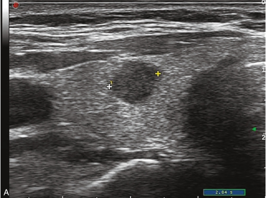 常规超声表现类似,超声造影后腺瘤常边界清楚,周边可见规则环状增强。实验室检查中降钙素、CEA升高对于髓样癌的确诊具有重要意义。