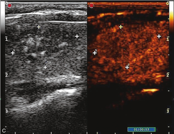 注射造影剂后,10s病灶早于周围甲状腺组织开始增强,呈不均匀高增强,13s达峰值,19s开始减退,至增强晚期病灶减退呈不均匀稍低增强。见图1-9-2、ER1-9-1。
