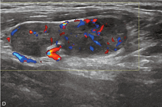 A.甲状腺右叶低回声结节纵切面灰阶超声图像;B.甲状腺右叶低回声结节横切面灰阶超声图像;C.CDFI图像