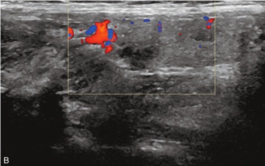 甲状腺左叶上极及下极分别可见一个低回声,大小约为0.8cm×0.9cm×0.6cm,边缘模糊,纵横比>1,内可见多发点状强回声;CDFI示结节内均未见明显血流信号。双侧颈部可见多发肿大淋巴结,其中左侧Ⅲ区可见一个大小为2.2cm×0.8cm、形态规则、淋巴门回声偏心、皮质回声增厚的结节;CDFI示淋巴结内可见丰富血流信号,见图1-9-3。