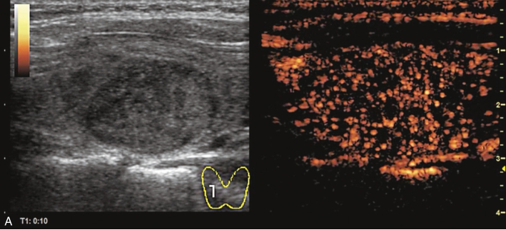 超声造影时多表现为与周围正常甲状腺组织同步或稍早于周围甲状腺组织,呈弥漫性均匀性等增强均匀或高增强。