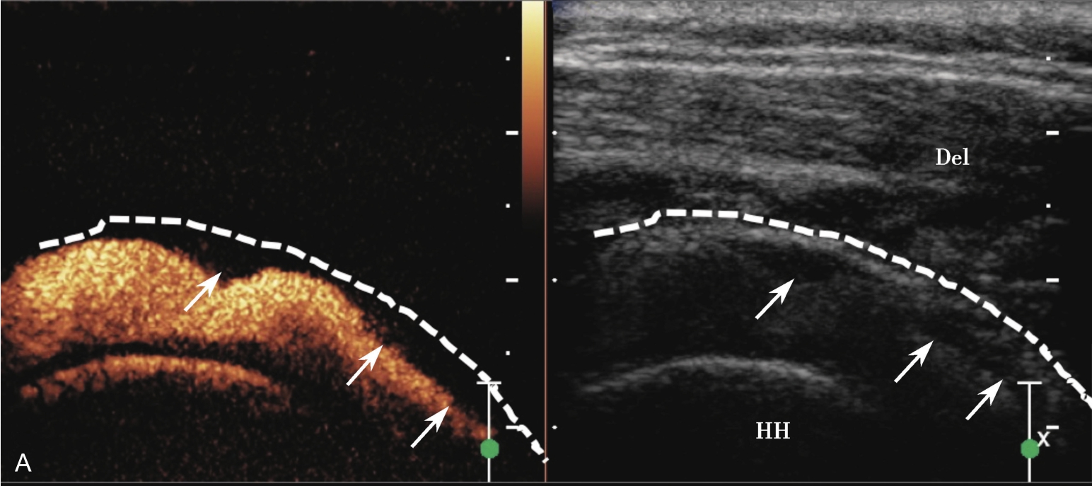 A.注入生理盐水及造影剂混合液后关节腔内充盈缺损(增厚的关节囊,箭头所示);B.关节腔内粘连带形成(箭头所示);虚线:关节囊;HH:肱骨头;Del:三角肌