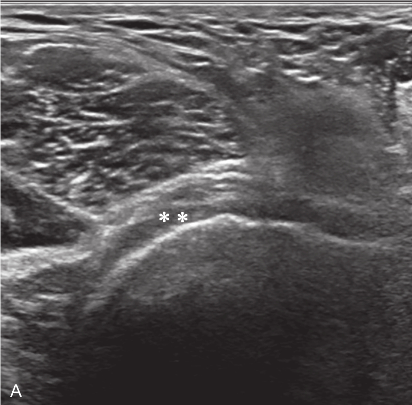 A.患侧肩关节下关节囊增厚;B.对侧正常关节囊;C、D.注射治疗后扩张的关节腔内粘连带;双星号:关节囊;箭头:粘连带;单星号:关节腔