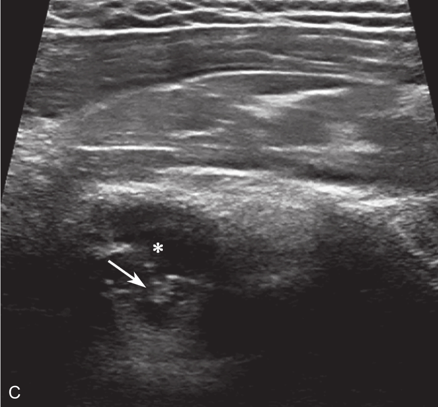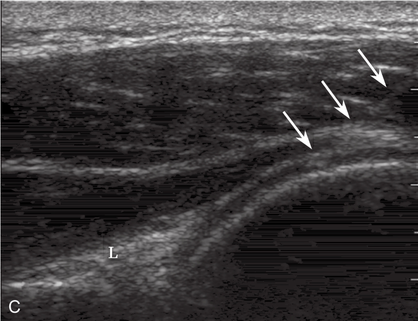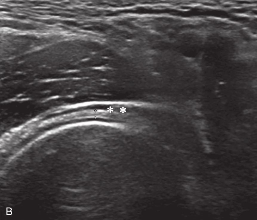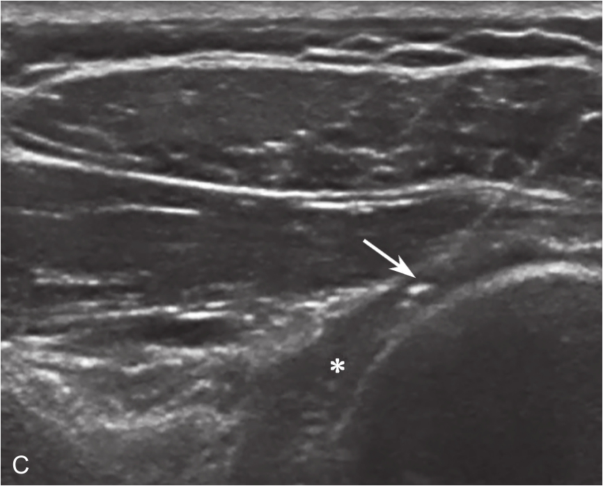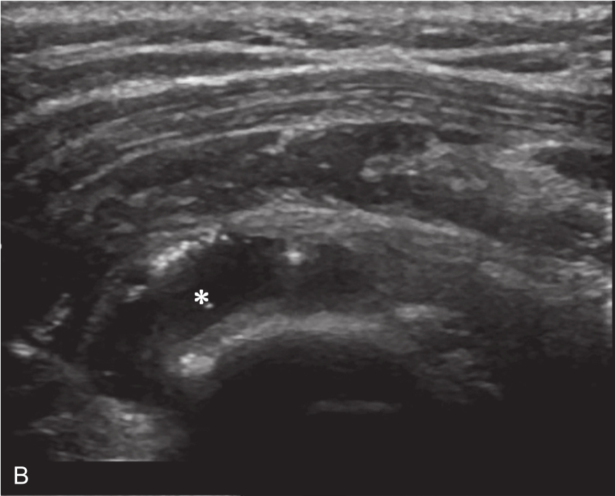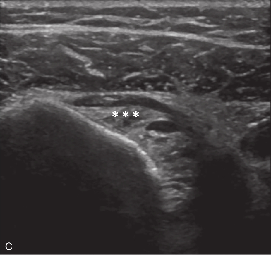 A.超声引导下穿刺针进入盂肱关节;B.注射治疗后扩张的关节腔;C.注射治疗后关节腔内粘连带;单星号:关节腔;三星号:关节腔内粘连带;箭头:穿刺针
