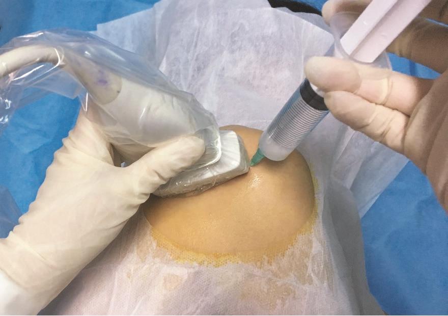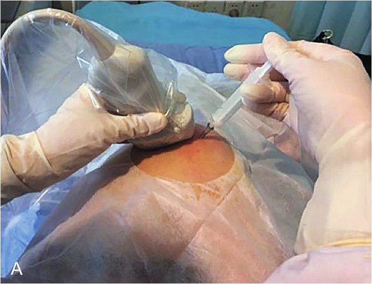 (1)针尖进入关节腔后,操作者可有“突破感”,此时仔细观察针尖,位于关节腔内,可推注少量液体,若阻力大则可能针尖抵住了骨软骨面,需调整针尖位置或方向。