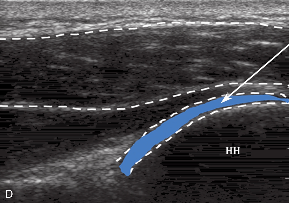 A、B.二维超声显示肩关节腔少量积液,滑膜增厚;C.超声引导针尖进入关节腔;D.超声示意图,虚线蓝色区域:后关节腔;单星号:腋下关节囊;双星号:后关节腔;短箭头:穿刺针;长箭头:穿刺针路径;L:盂唇;HH:肱骨头