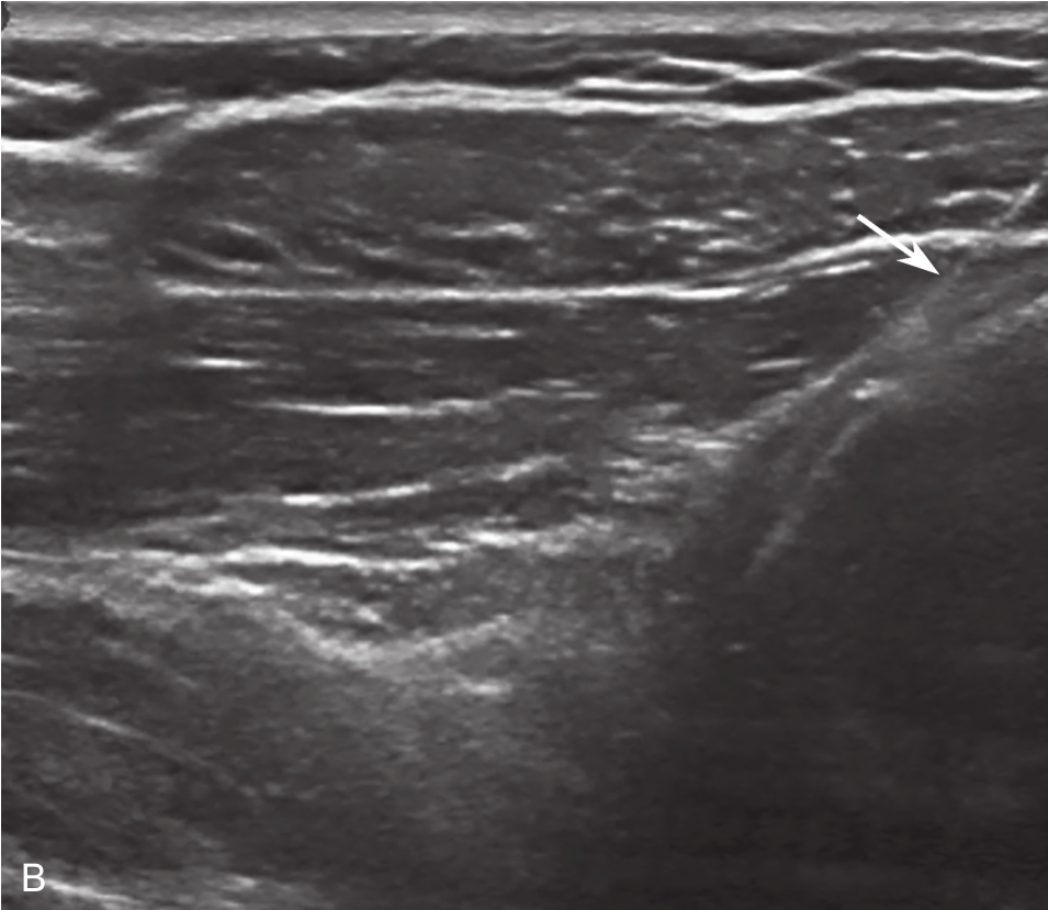 (2)若推注无阻力,则可继续推注药物,同时能观察液体在关节腔内分布(图2-6-4);若推注阻力大且超声显示周围肌肉组织水分离,则说明针尖不在关节腔内;或者关节腔内压力较大,提示有粘连(图 2-6-5,图 2-6-6)。