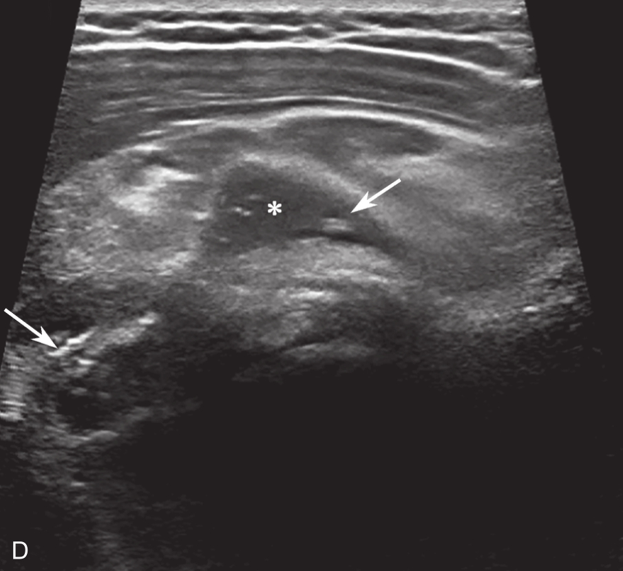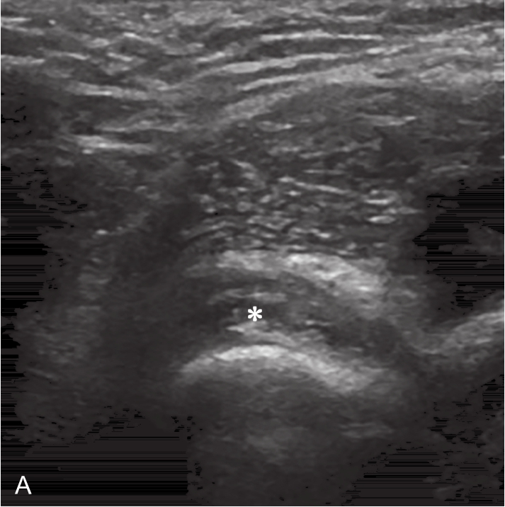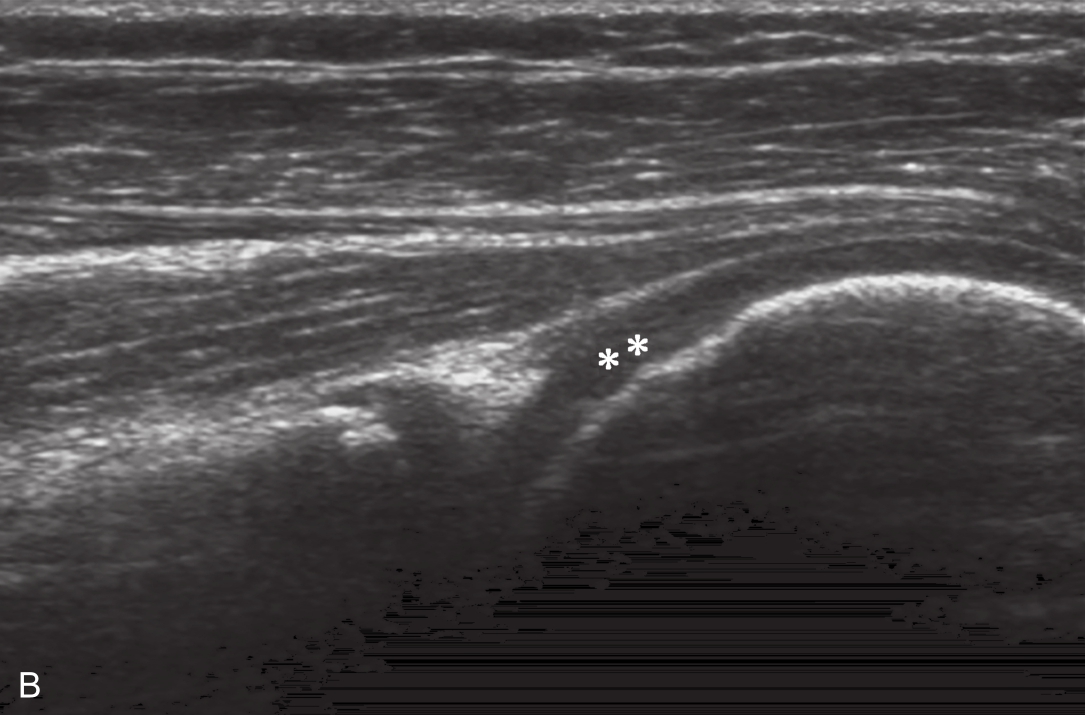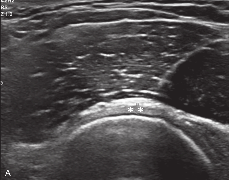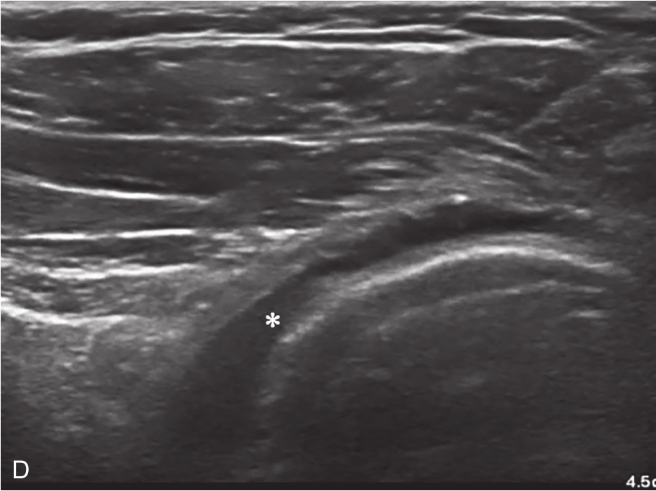 C.超声引导下类固醇及生理盐水注射;D.注射治疗后关节腔扩张;双星号:增厚关节囊;箭头:穿刺针;单星号:关节腔