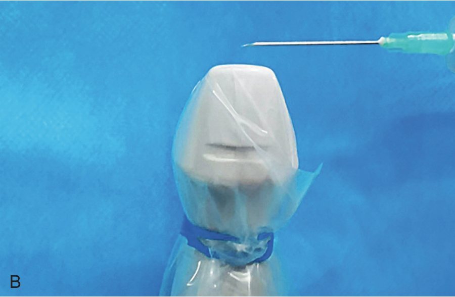 根据治疗目的、病灶的性质及大小等选择合适的抽吸、注射针及针管、抽吸所需用的药品等。由于肌骨疾病比较表浅,常不使用穿刺针,而且多为一针到位,注射药物内含有麻醉药物,无需使用局部麻醉,但对于手、足等敏感部位的介入治疗,尤其是对于经验不丰富的医生,则需要对穿刺部位行局部麻醉,常用2%利多卡因注射液皮下注射,以减轻患者的疼痛,便于操作顺利完成。使用类固醇激素时,常抽吸适量的生理盐水或与利多卡因注射液混合,根据病灶的性质和大小决定用量。