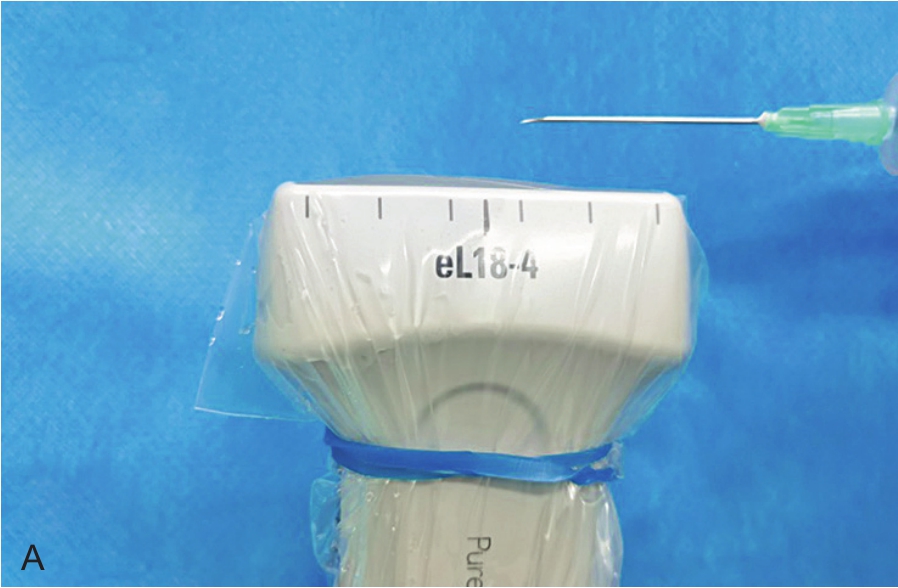 戴无菌手套,碘伏消毒穿刺部位2~3遍,铺无菌洞巾,用无菌探头套包裹涂有耦合剂的超声探头。