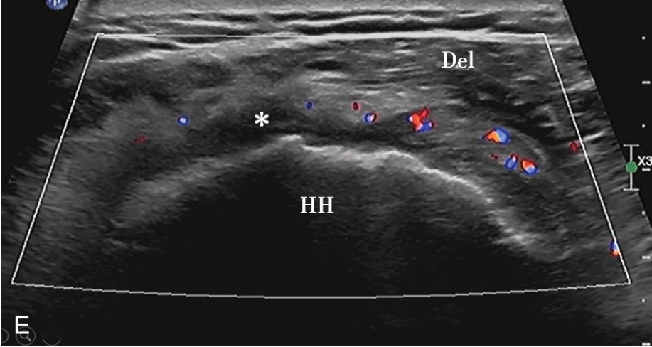 A.造影剂从滑囊(单箭头)及冈上肌腱撕裂处达肱骨头表面(双箭头),星号:滑囊撕裂处;B.冈上肌腱(SUP)回声不均匀,箭头:连续的滑囊,星号:滑囊回声中断,HH:肱骨头;C肱二头长头腱鞘内可见造影剂高增强(箭头);D:肱二头肌肌腱横断面(星号),腱鞘内造影剂(箭头);Del:三角肌;LT:肱骨小结节;GT:肱骨大结节