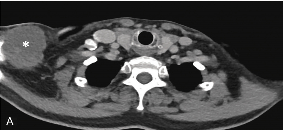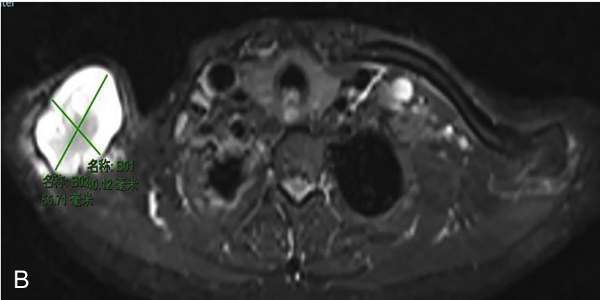 A~B.患者肩关节MRI,星号及测量键:滑膜囊肿