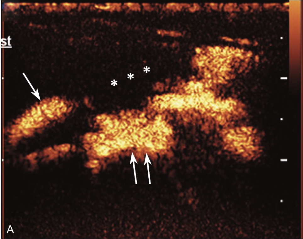 ● 药物内加入少量(0.2~0.5ml)超声造影剂,可在治疗疾病的同时,观察有无肩袖滑囊面或完全的撕裂,判断撕裂程度和范围。