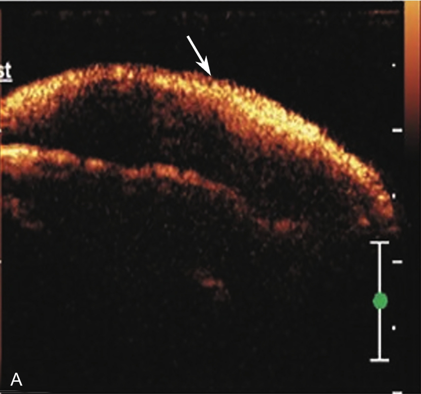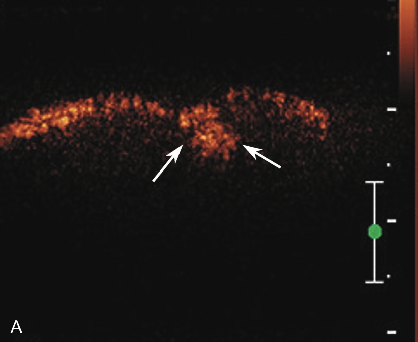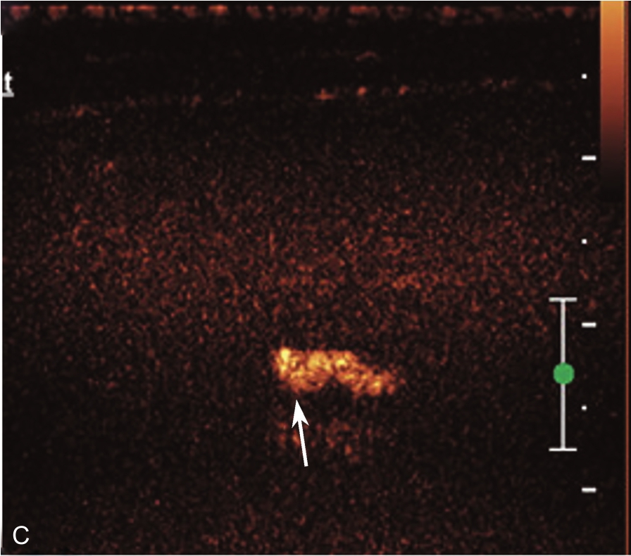 3.当肩袖回声不均匀,有可疑的滑囊面撕裂或全层撕裂,行超声引导下肩峰下-三角肌下滑囊造影检查,可提高对肩袖撕裂的诊断率。方法:将2~5ml生理盐水与0.5ml的超声造影剂混合后,注入肩峰下-三角肌下滑囊,无撕裂的滑囊呈线状高增强(图2-1-8),肩袖滑囊面部分撕裂可见造影剂混合液从滑囊进入肩袖肌腱内而未达肱骨头表面(图2-1-9),若观察到其进入肩关节腔或肱二头肌长头腱鞘,则诊断肩袖全层撕裂(图2-1-10)。