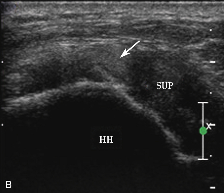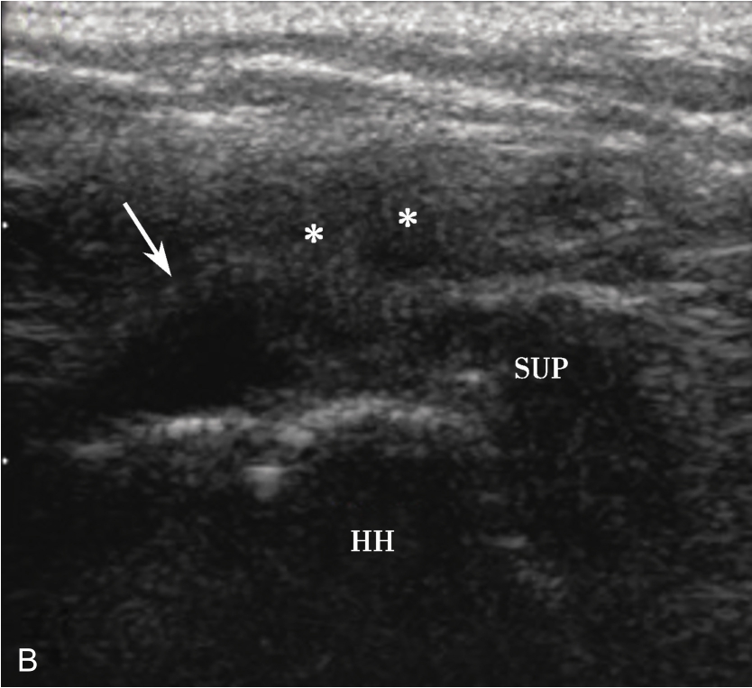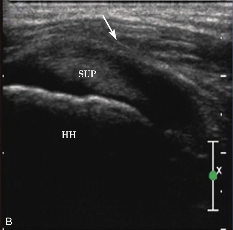 A.超声引导下滑囊内注入超声造影剂后,滑囊呈线状高增强(箭头);B.注入造影剂后的滑囊(箭头),冈上肌腱(SUP)连续性好,未见撕裂,HH:肱骨头