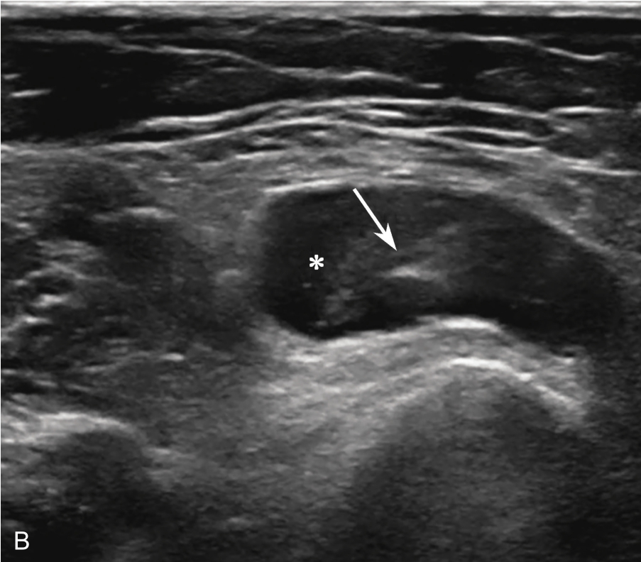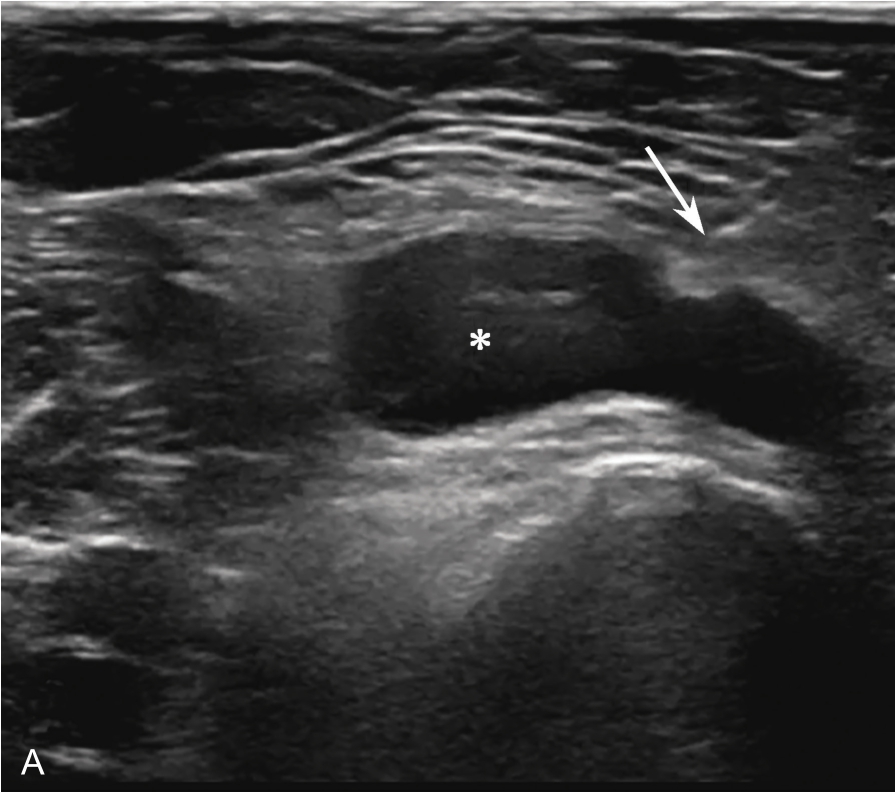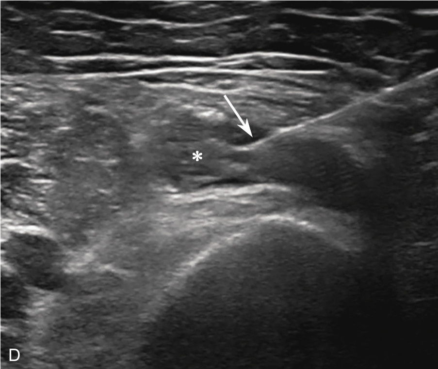 A.超声引导下穿刺针进入滑囊前;B.穿刺针进入滑囊内;C.液体抽吸后,滑囊变小;D.超声引导下药物注射;星号:滑膜囊肿;箭头:穿刺针