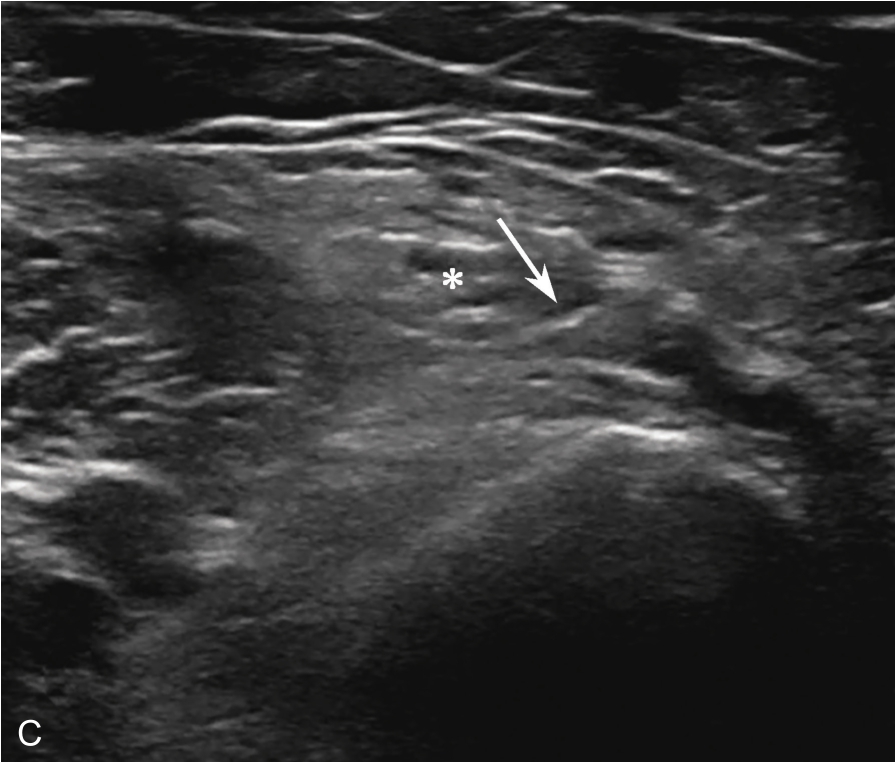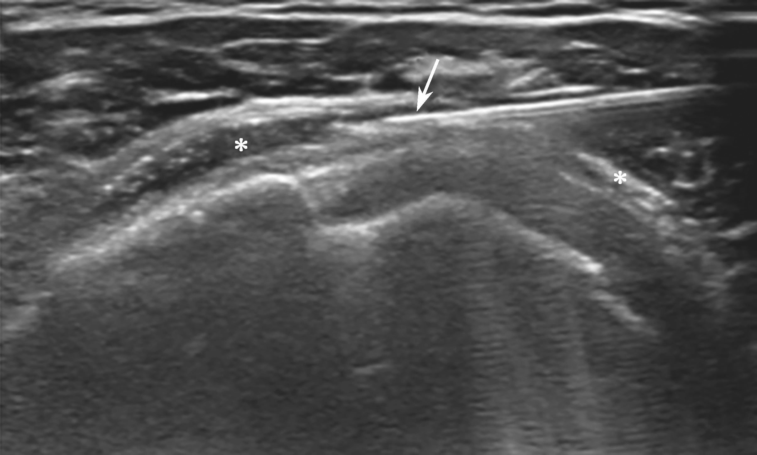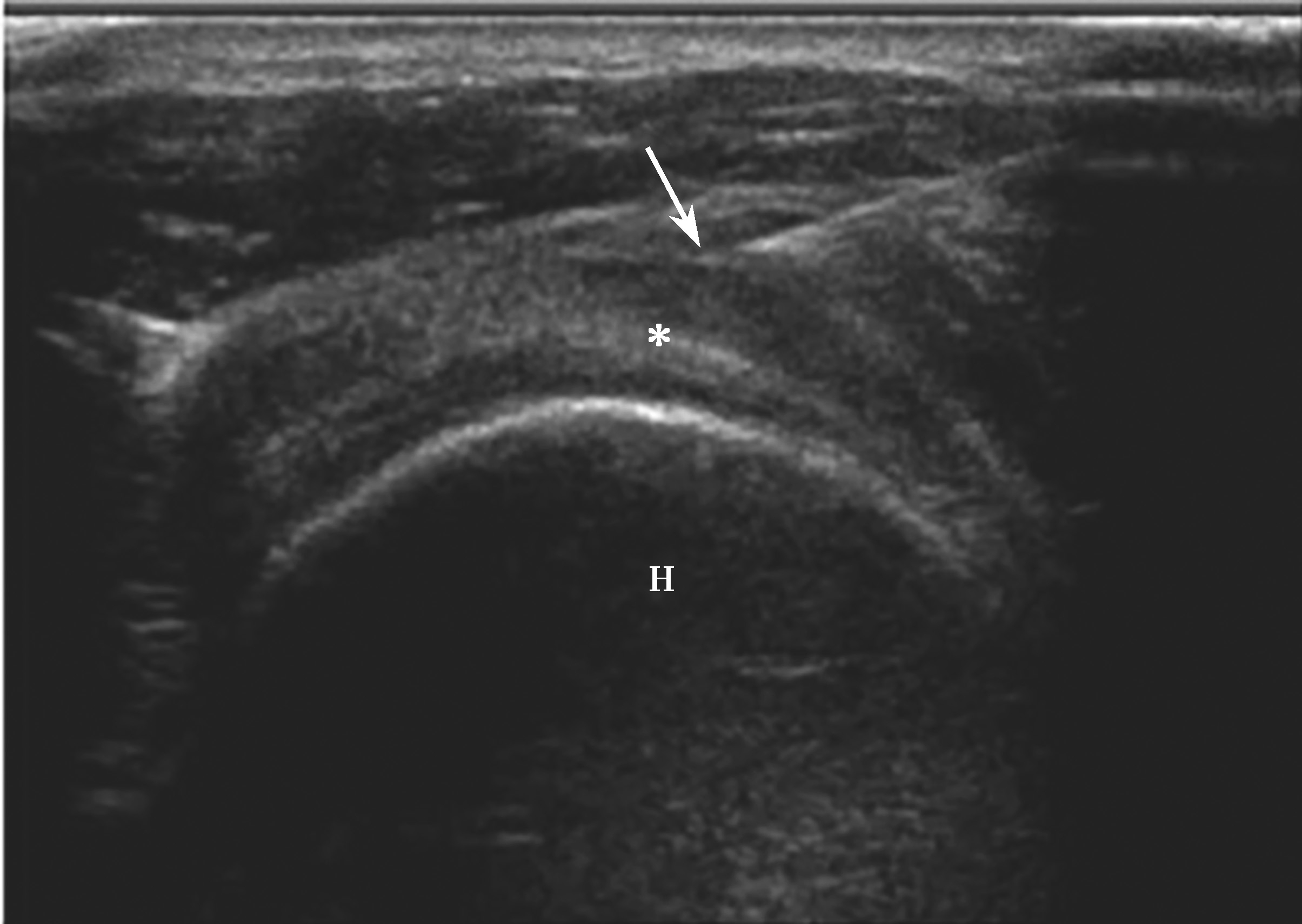 箭头:显示穿刺针尖进入滑囊;星号:冈上肌腱;H:肱骨头