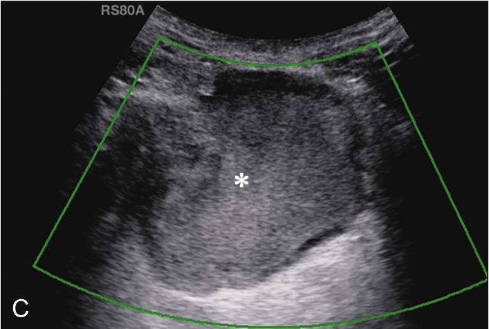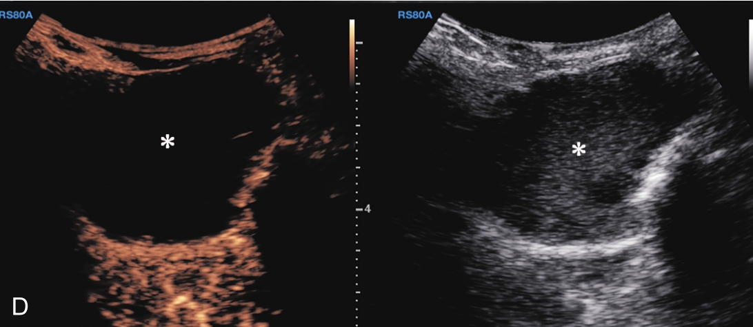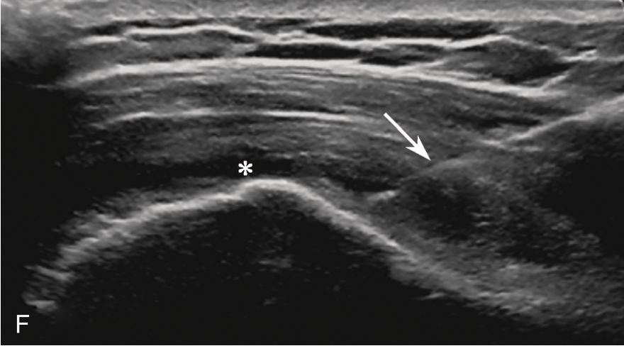 C.彩色多普勒显示囊性团块(星号)内无血流信号;D.超声造影显示囊性团块内呈无增强;E.冈上肌腱完全断裂,关节腔积血(星号);F.超声引导下穿刺液体抽吸及药物注射治疗,箭头示穿刺针