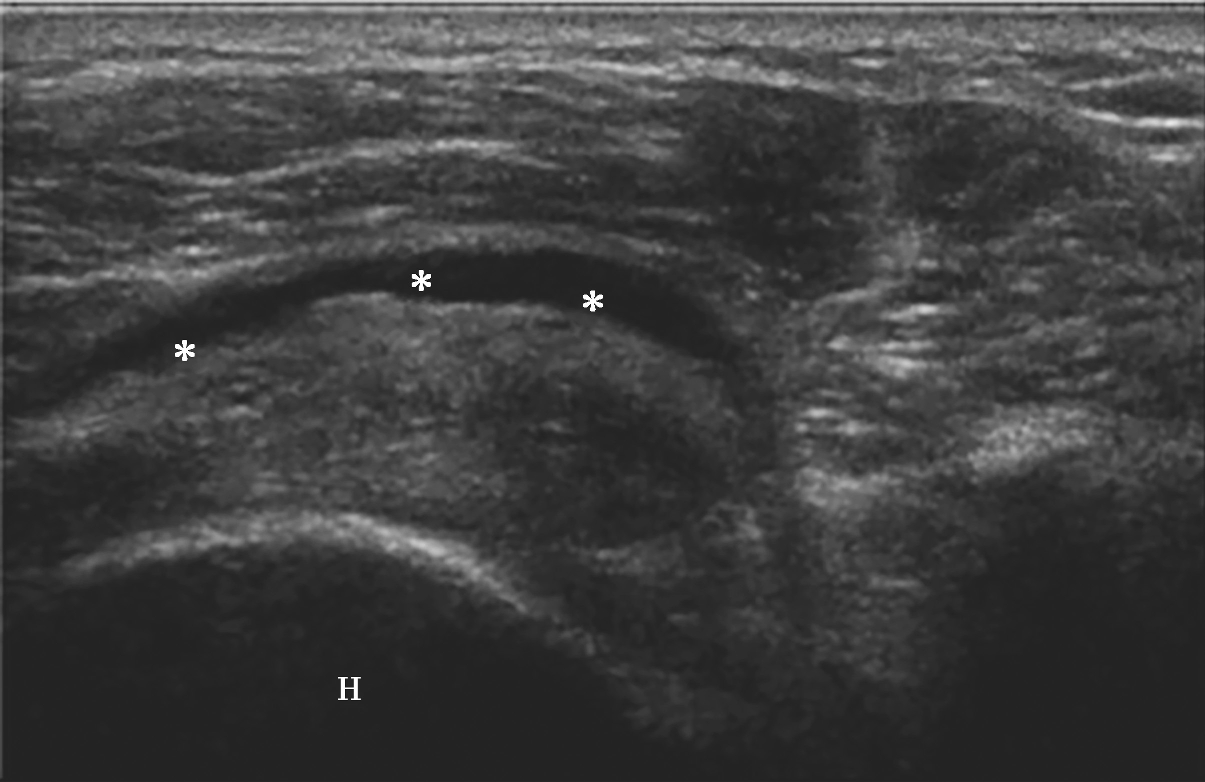 星号:药物注射后在滑囊内均匀弥散;H:肱骨