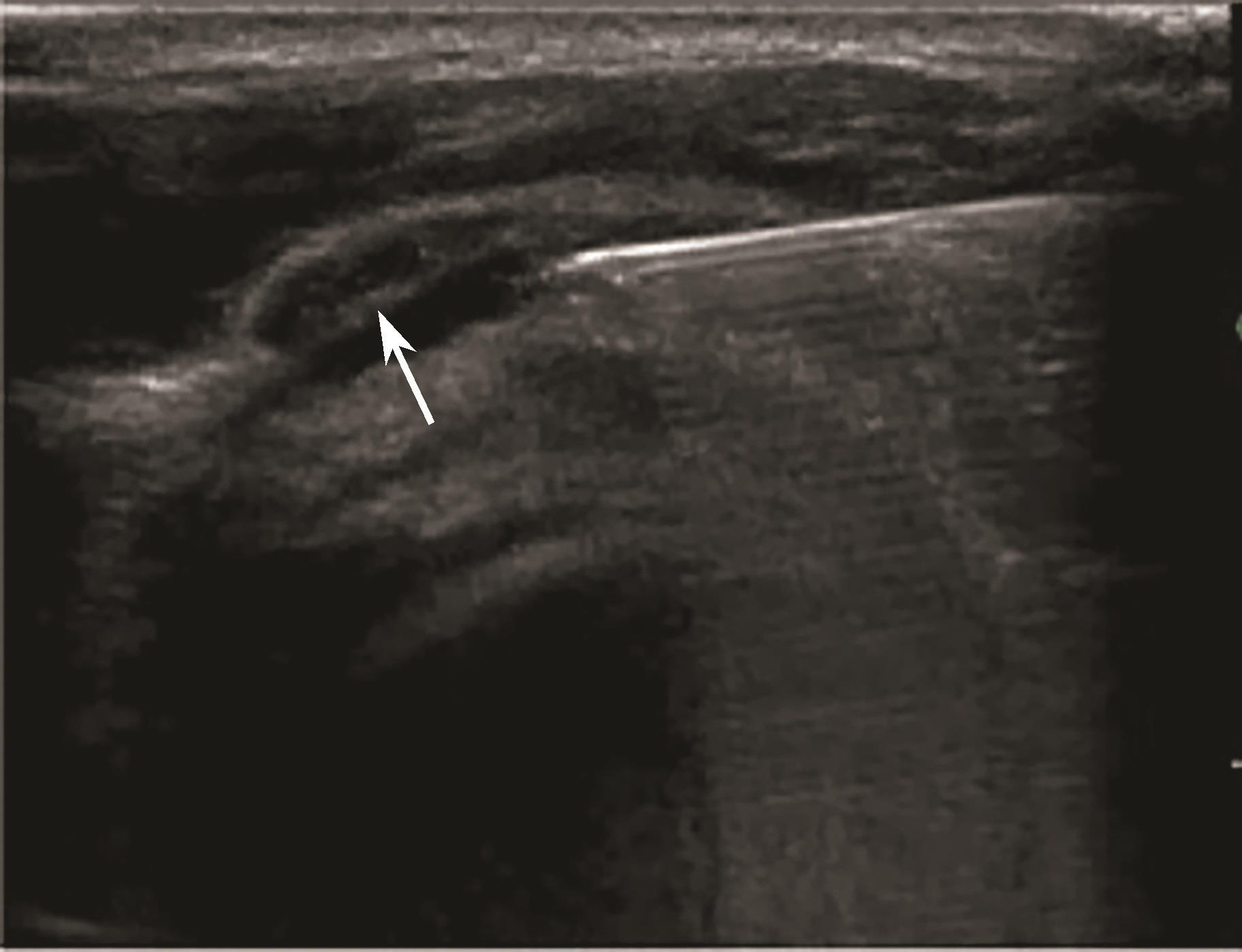 箭头:扩张后滑囊内的粘连带呈线状稍强回声
