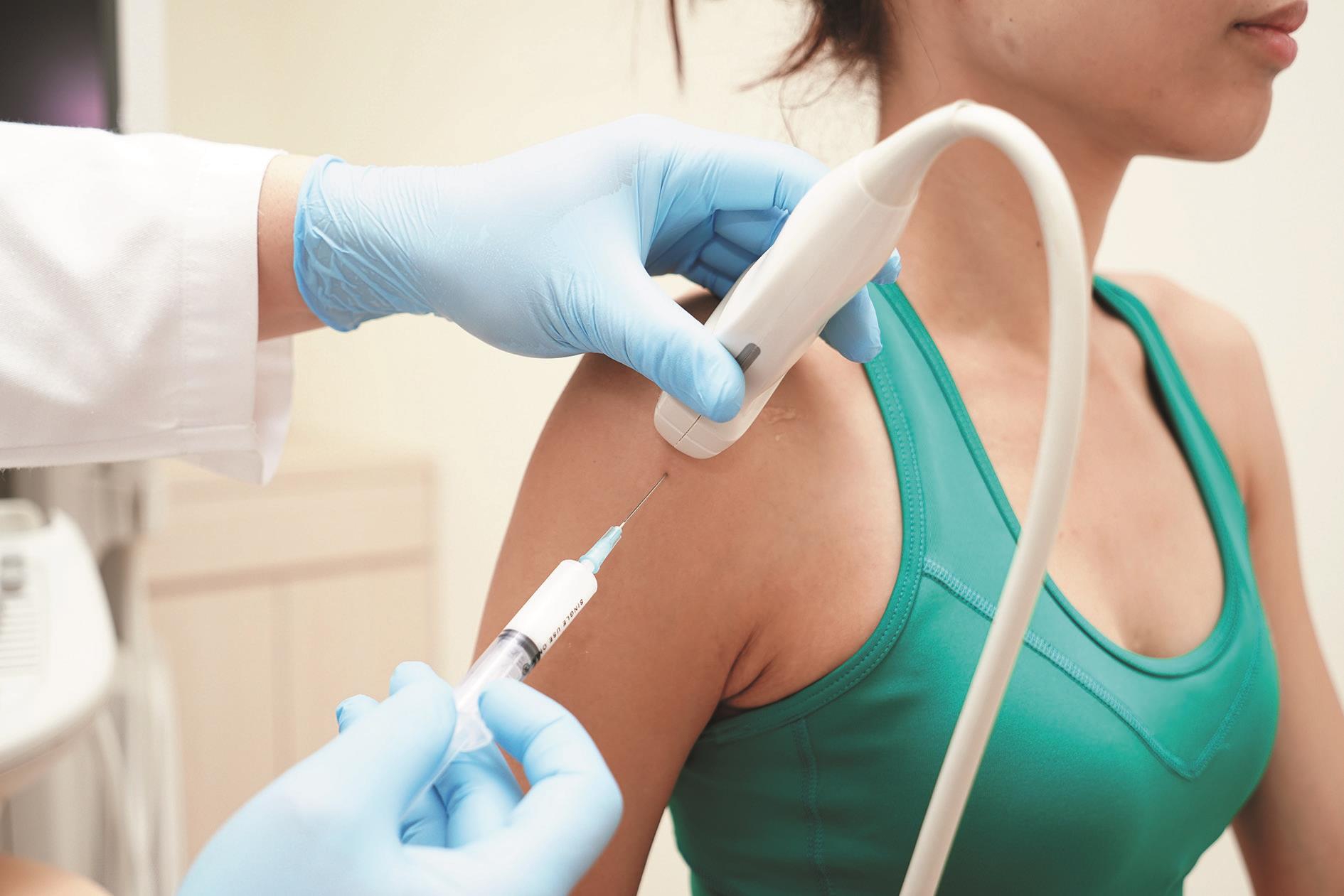 ▲ 图2-1-3 超声引导下肩峰下-三角肌下滑囊注射操作图