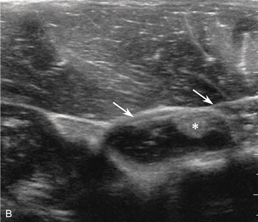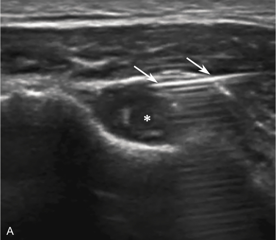 A、B.超声引导下平面内进针法,针尖进入腱鞘内;箭头:穿刺针;星号:肌腱
