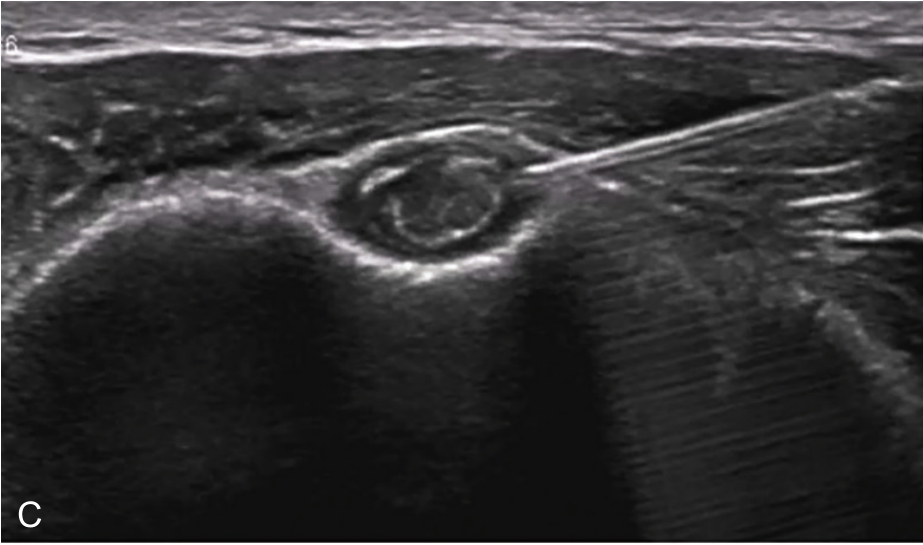 ▲ 图2-3-3 超声引导下肱二头肌长头腱鞘介入治疗操作图(三)