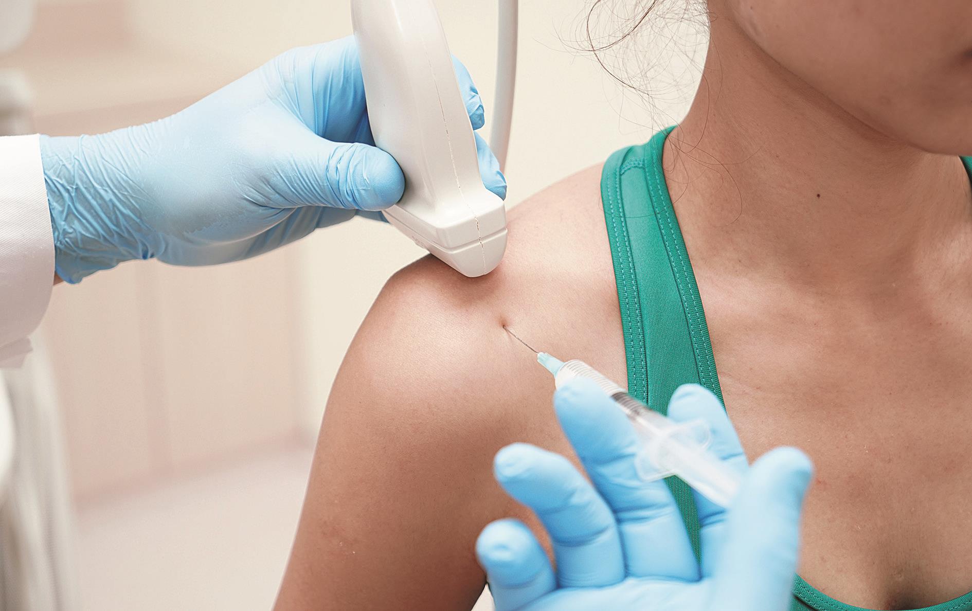 ▲ 图2-4-1 超声引导下肩锁关节腔介入治疗操作图