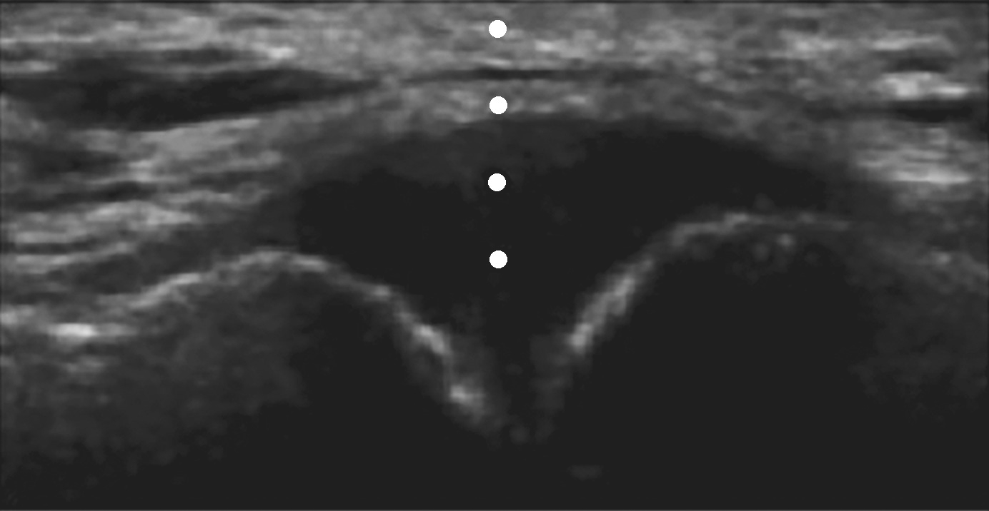 平面外进针法,圆点:进针过程中针尖出现的位置