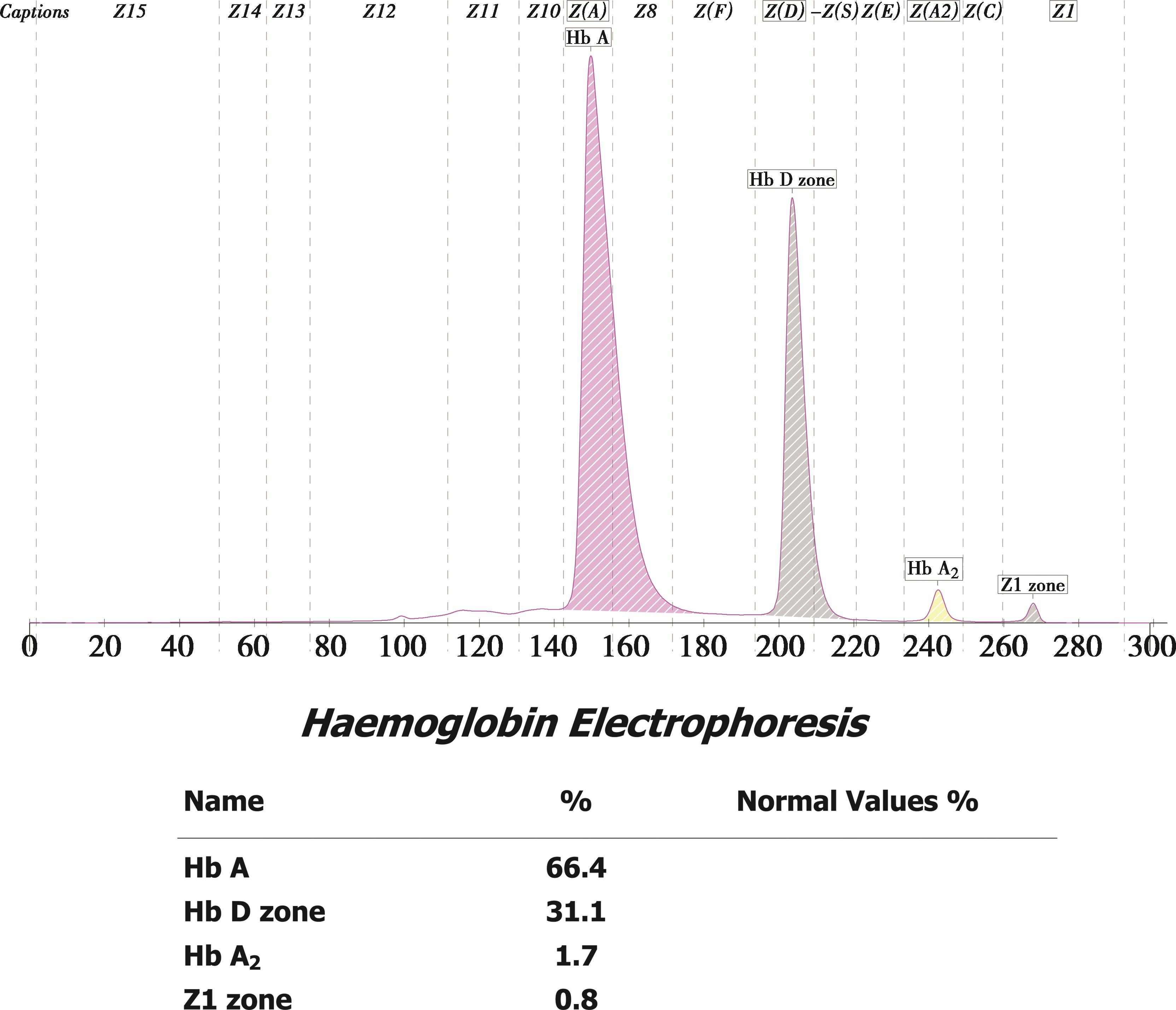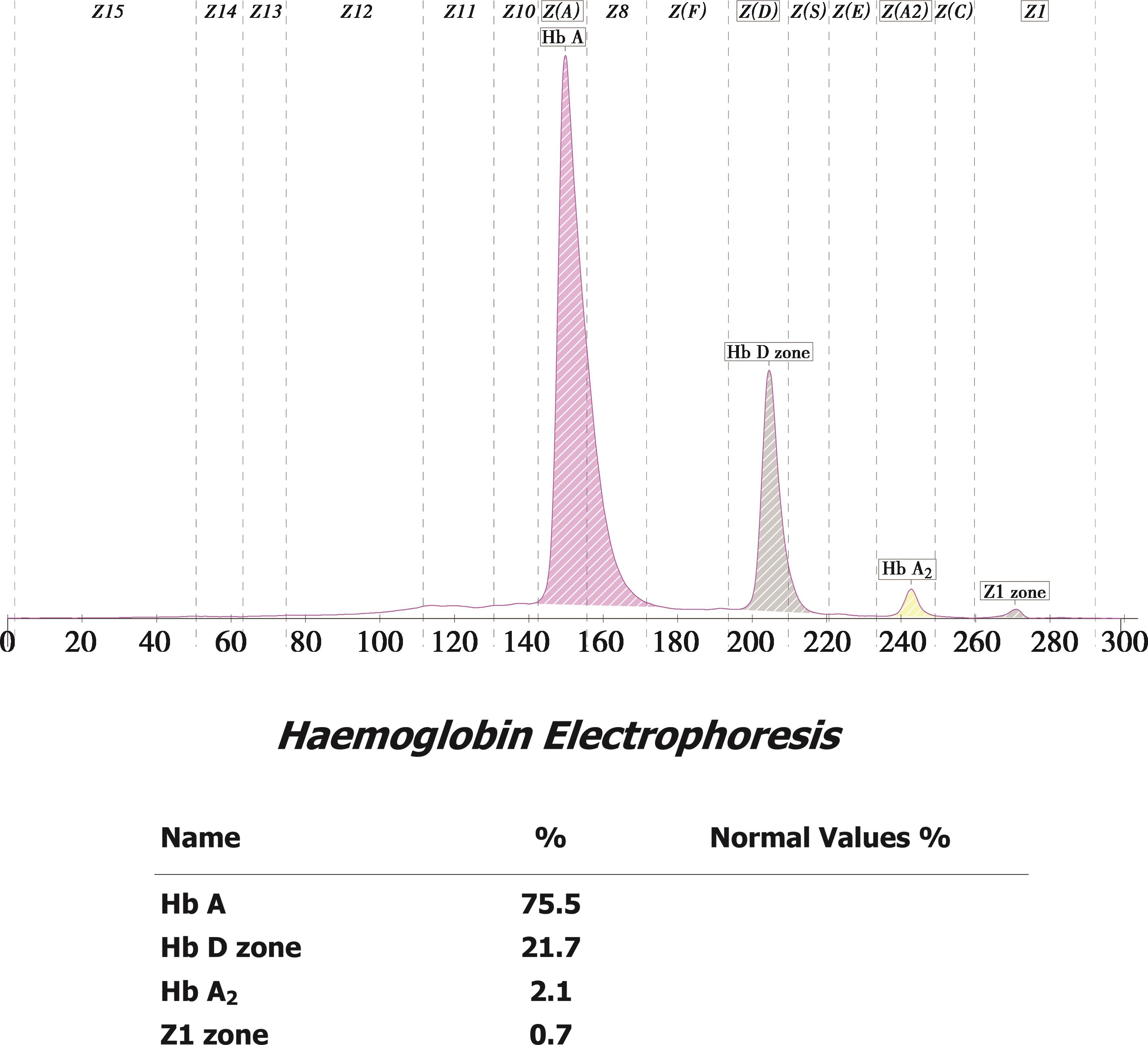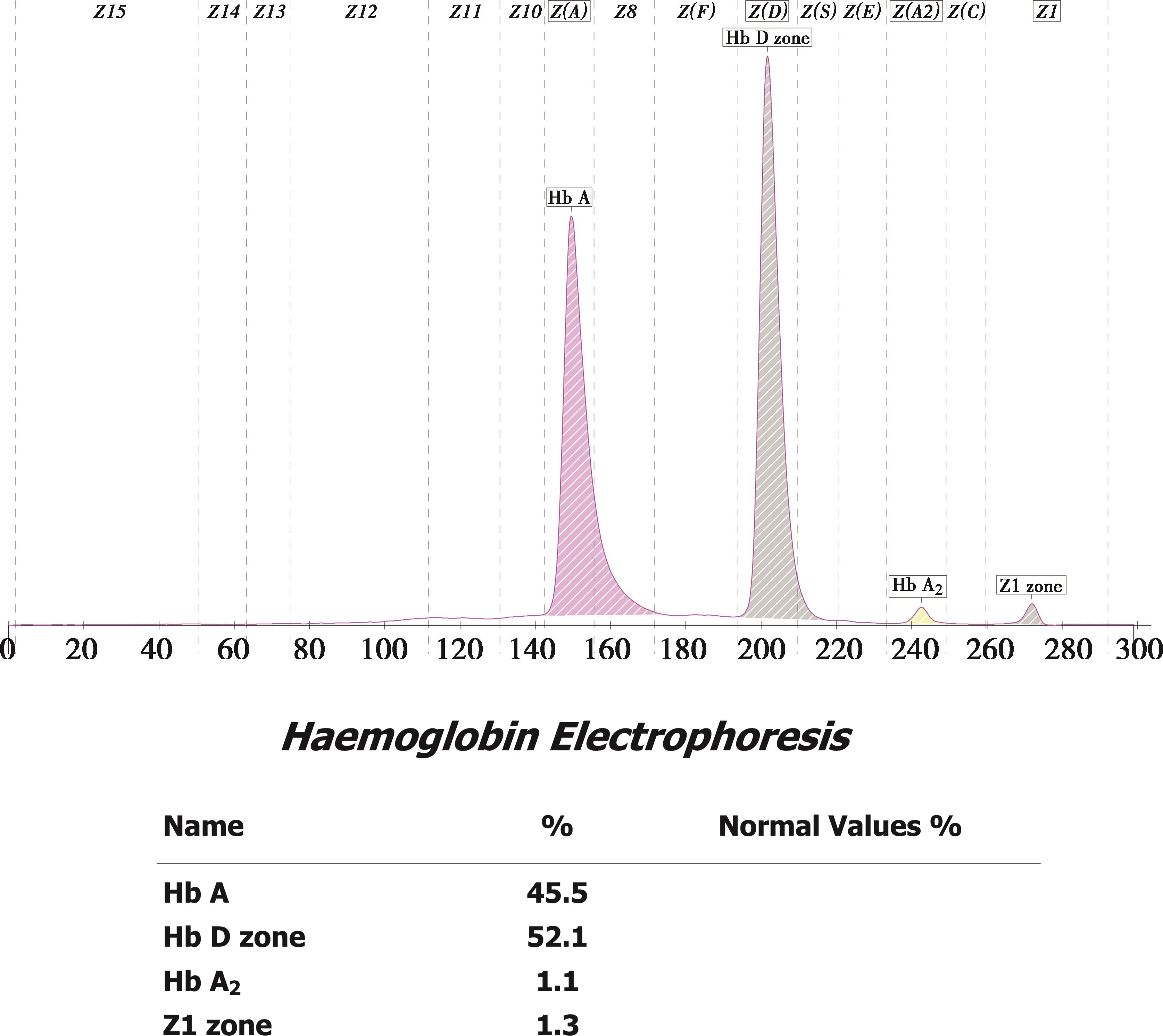 毛细管电泳法血红蛋白分析显示异常血红蛋白条带位于D区(图2-56),含量为(51.7±0.6)%,Hb A 2 为(2.4±0.2)%。相关实验室检查结果:RBC(5.37±0.38)×10 12 /L,Hb(112±11)g/L,MCV(66.5±2.4)fL,MCH(20.9±0.6)pg,常规地中海贫血基因检测结果均为 -- SEA /αα,测序结果为 Hb G-Honolulu[ HBA2 :c.91G>C,CD30(GAG>CAG),Glu>Gln]。