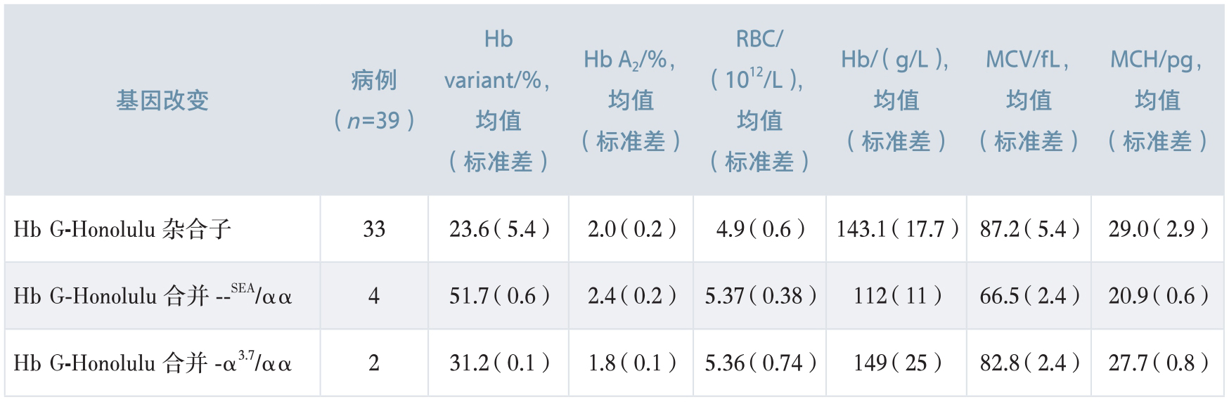 表2-1 Hb G-Honolulu复合地中海贫血的电泳和血常规结果