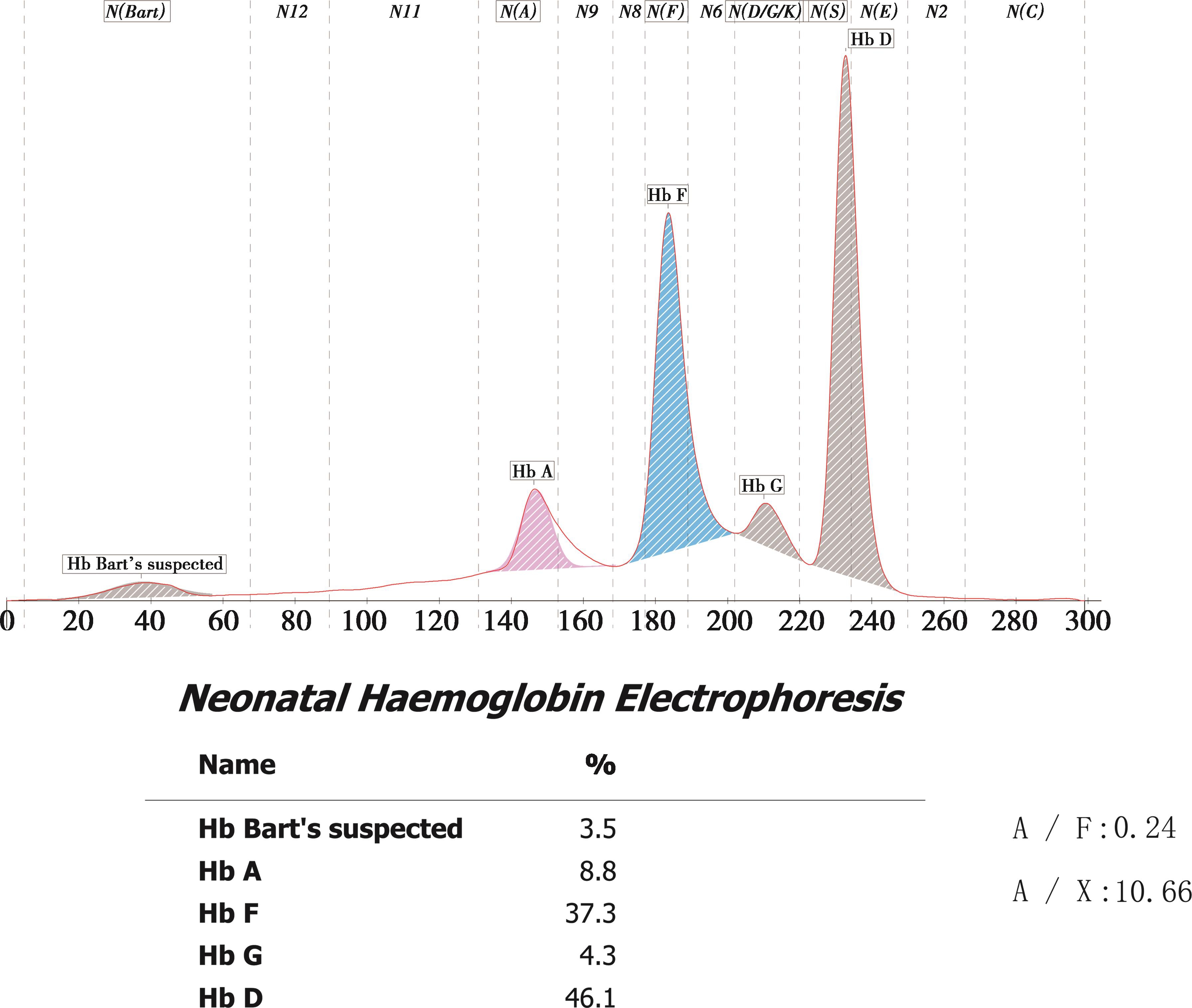毛细管电泳法血红蛋白分析显示异常血红蛋白位于N(D/G/K)区和N(S)区,含量分别为4.3%和46.1%,疑似Hb Barts(血红蛋白巴特)3.5%(图2-58)。相关实验室检查结果:常规地中海贫血基因检测结果为-- SEA /αα,测序结果为Hb G-Honolulu[ HBA2 :c.91G>C,CD30(GAG>CAG),Glu>Gln]。