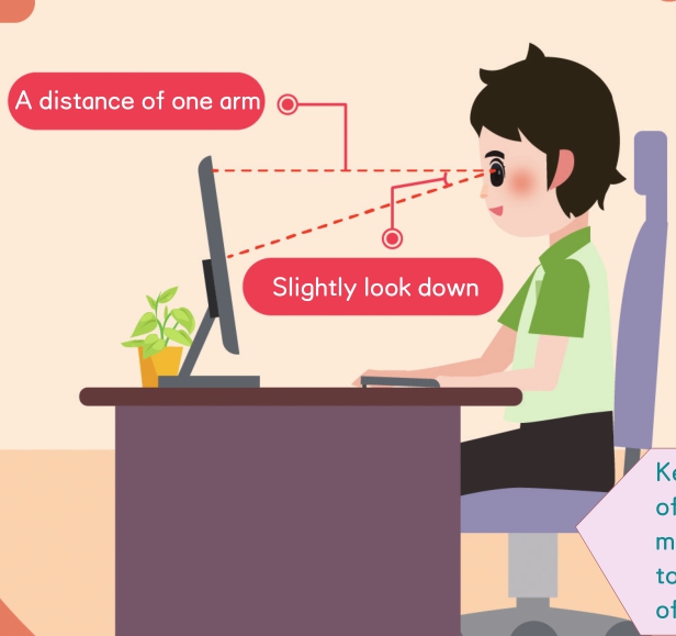 (1) Students should maintain a distance of 50 cm (about one arm) between the eyes and the monitor when using a computer. The eyes are slightly looking down; that is,the sightline at the monitor is somewhat downward with a 15-degree angle instead of keeping it horizontal. Or keep the center of the monitor ten centimeters below the horizontal sightline.