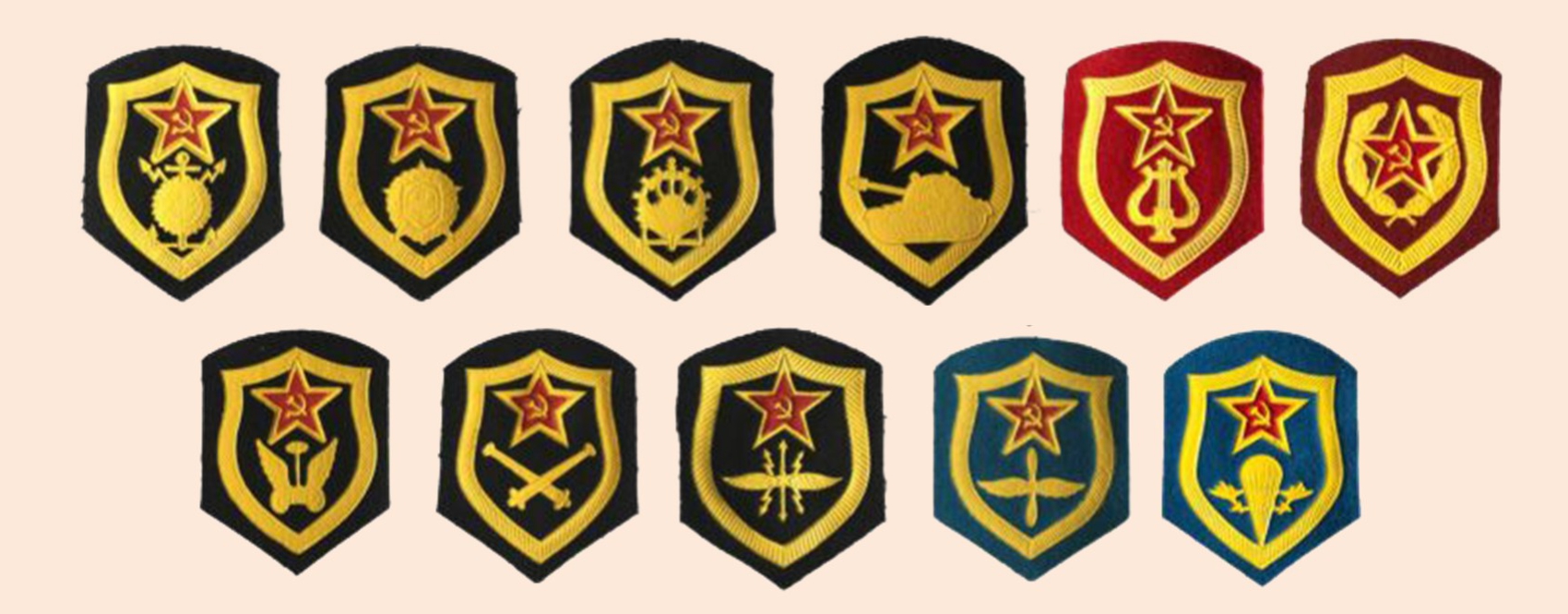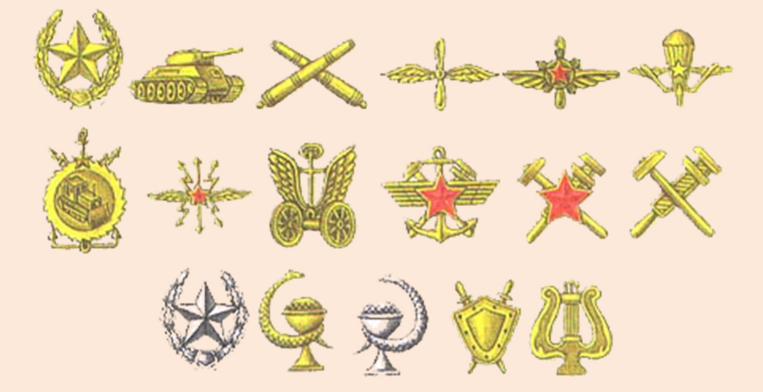 在苏联时期,军队纹章的基础图案是五角星形式的纹章图像(图13)。尽管苏联军事武装部队各单位没有自己的纹章,但是,通过学习俄罗斯帝国各军兵种纹章标识的设计情况,苏联军队也创建了各兵种部队和辅助单位的标识系统(图14)。