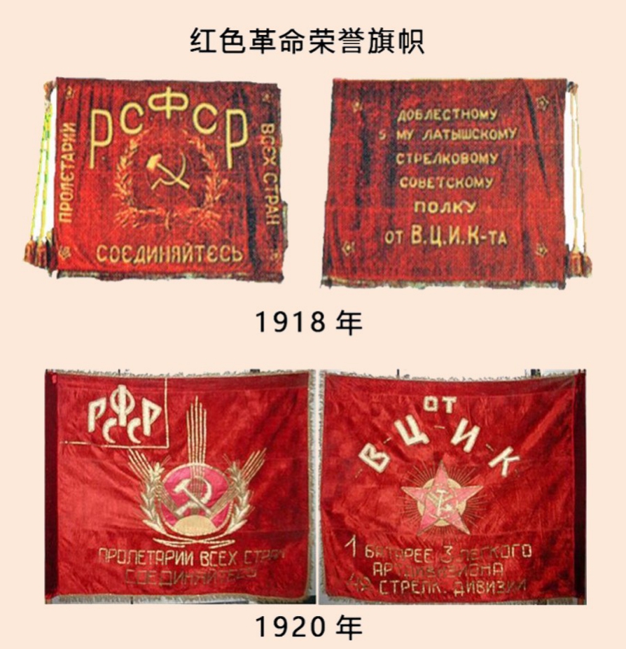 苏联历史时期,革命荣誉红旗成为武装部队第一个纹章外观的区分标识。它出现在1918年8月,是战斗旗帜的前身。随着政权的确立,红旗的图案和标识发生了变化,战旗的设计也随之发生变化(图10)。