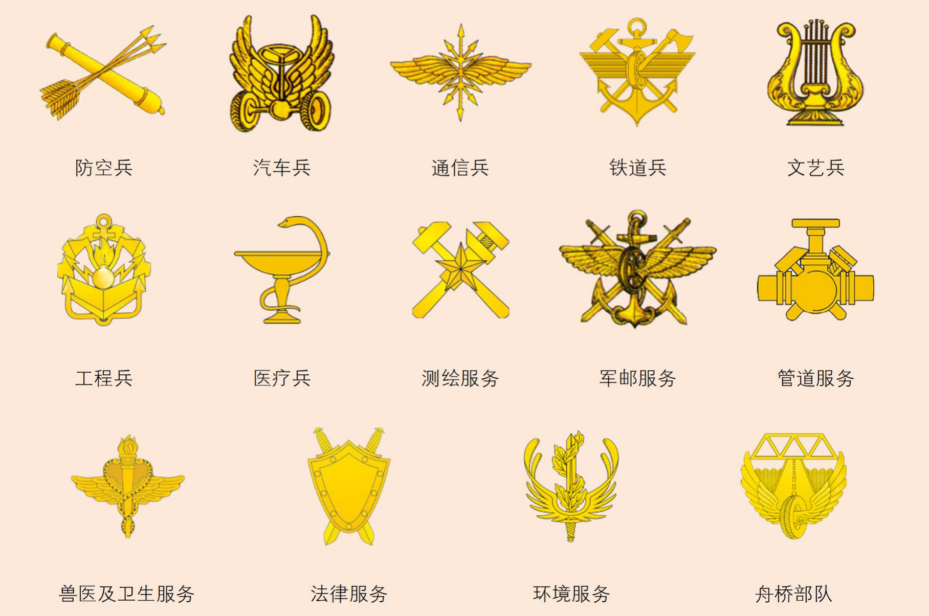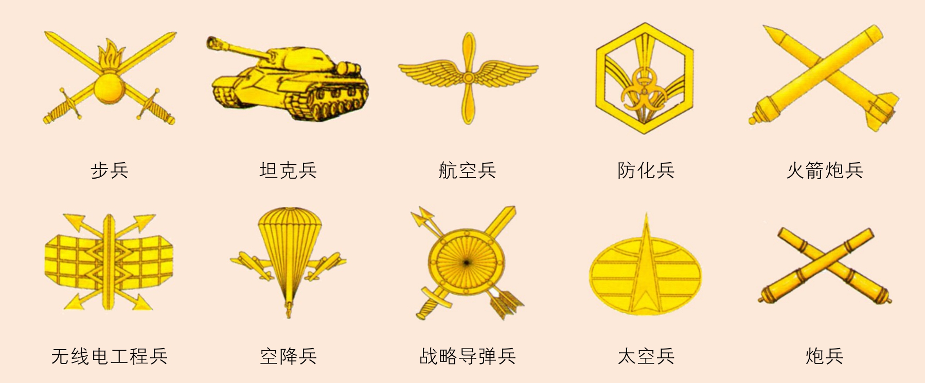 此外,俄联邦借鉴吸收了俄罗斯帝国和苏联时期的各兵种标识元素,为每个兵种/职能部队设计了小徽章,这些小徽章通常佩戴在军衔和衣领上(图18)。