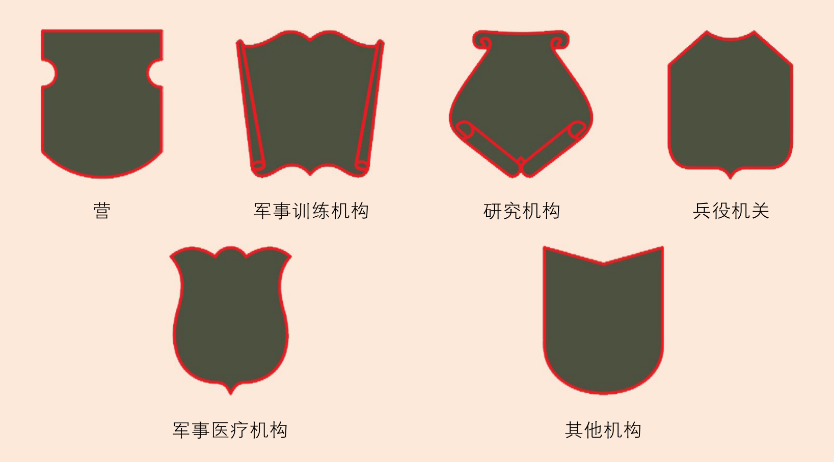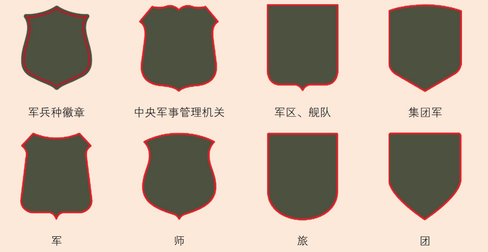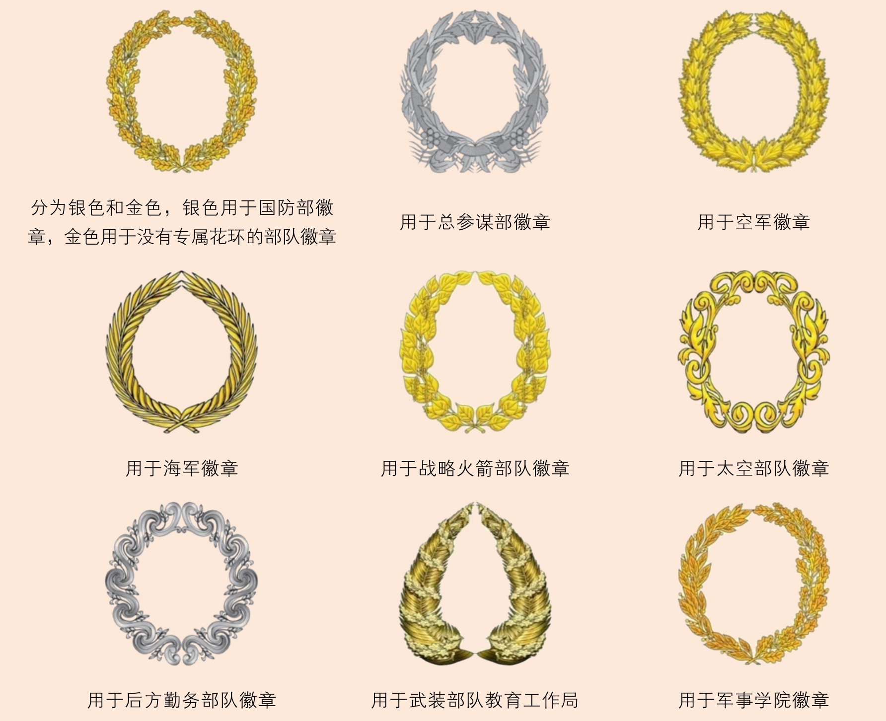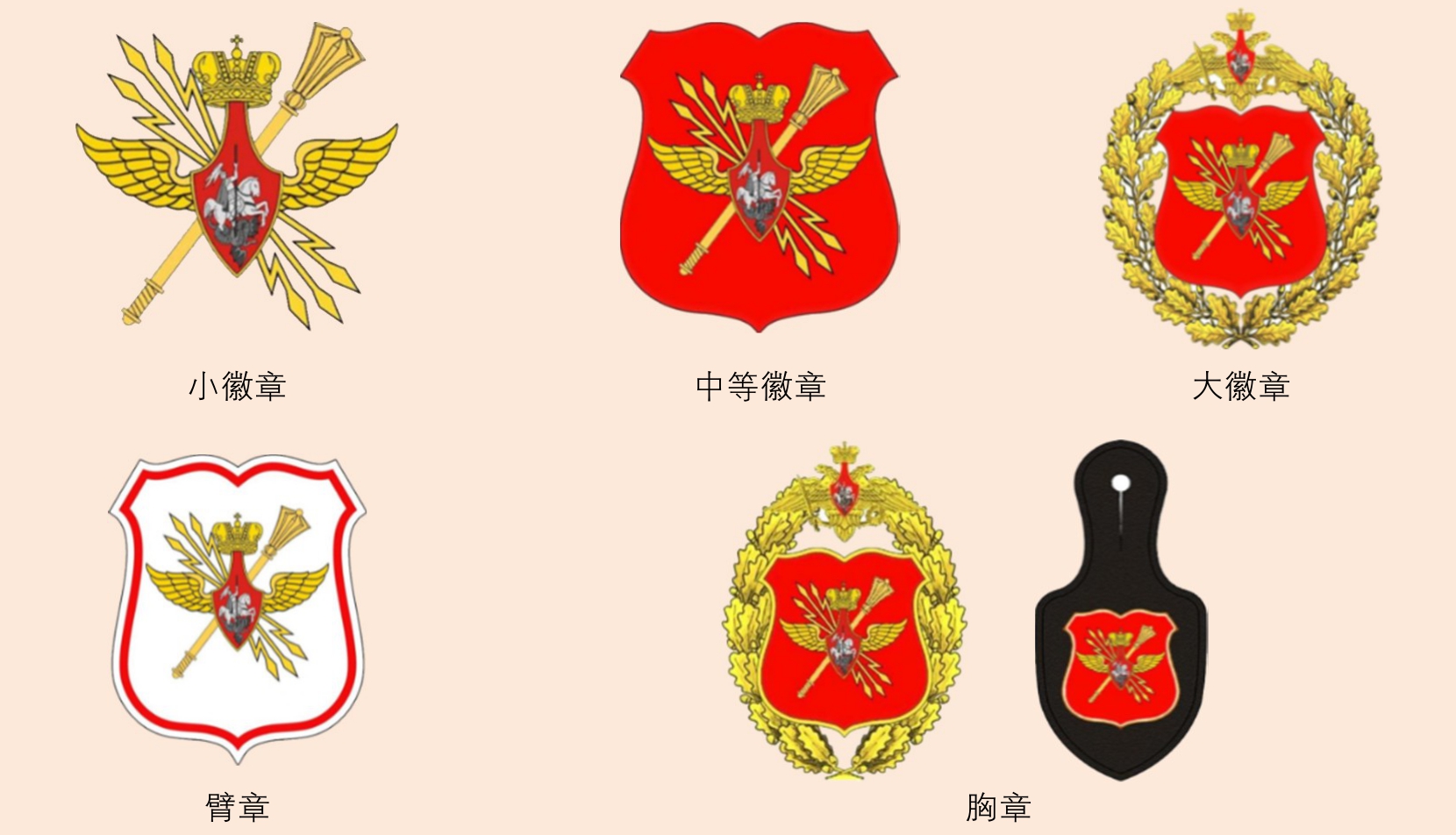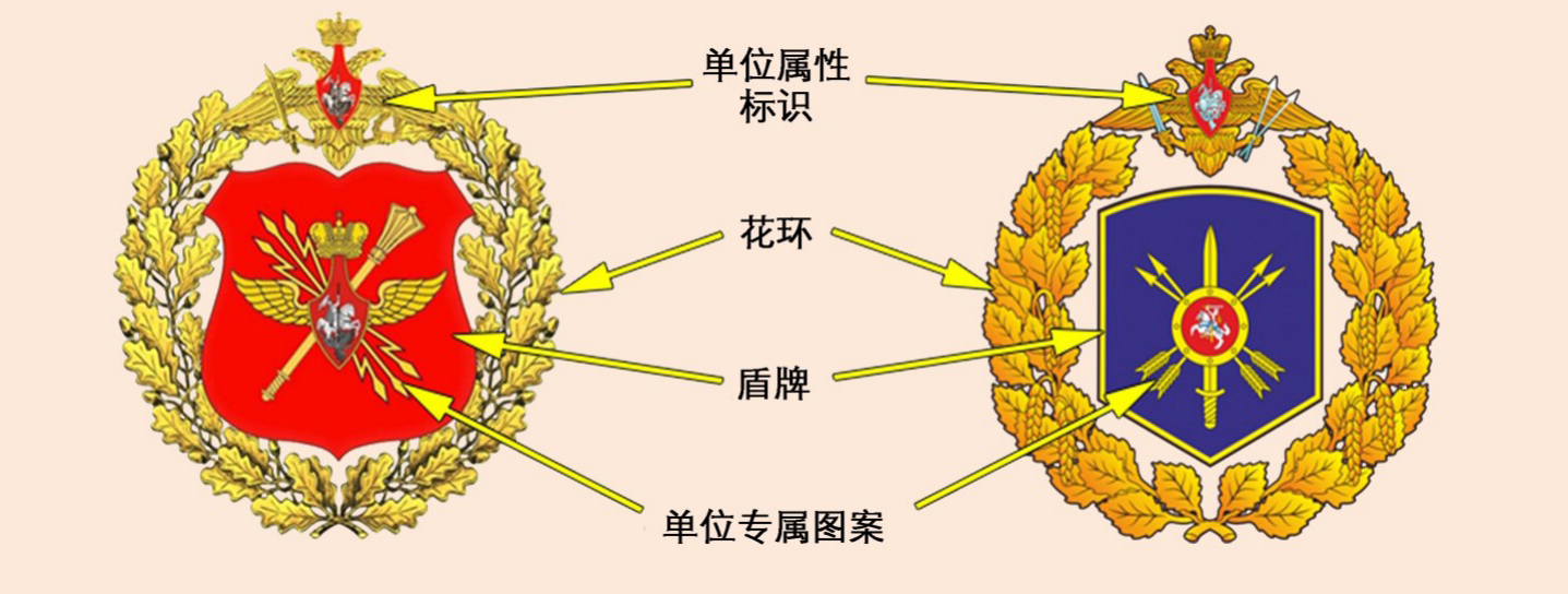 俄军每个军种、部门、部队和机构都拥有特色纹章,主要包括小徽章、中等徽章、大徽章、臂章和胸章等(图15),它们分别用于不同着装和场合。其中,大徽章是反映一个单位要素最为全面的标识,其主要包括四个元素:单位属性标识、花环、盾牌和单位专属图案(图16)。俄联邦武装力量属性不同,花环的样式也会有所不同(图17)。