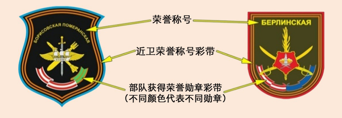 新的俄联邦武装力量纹章设计相较于俄罗斯帝国、苏联时期及俄联邦成立早期的一个明显创新是统一和规范了臂章的形制,以标识的形状来区分武装力量的属性和级别(图19)。每个军兵种会以不同的底色加以衬托(图20)。此外,在臂章上还设计了一些彩带元素来显示该部队所取得的荣誉(图21)。